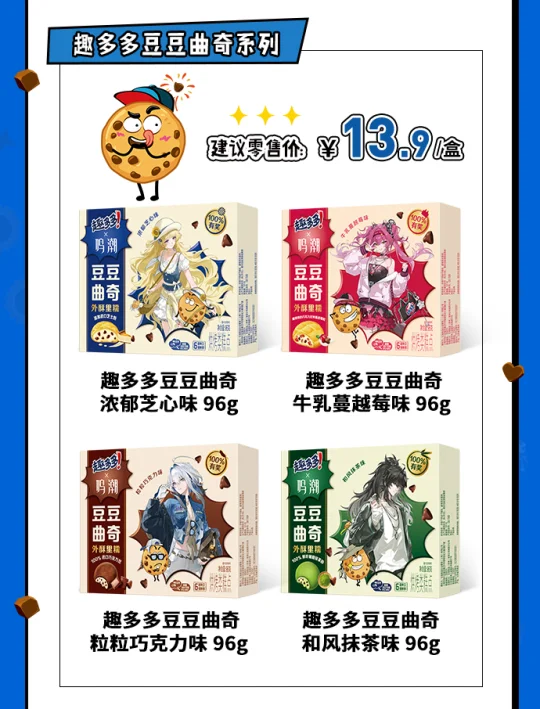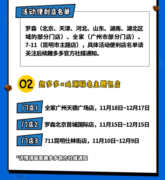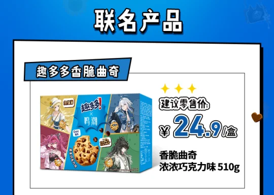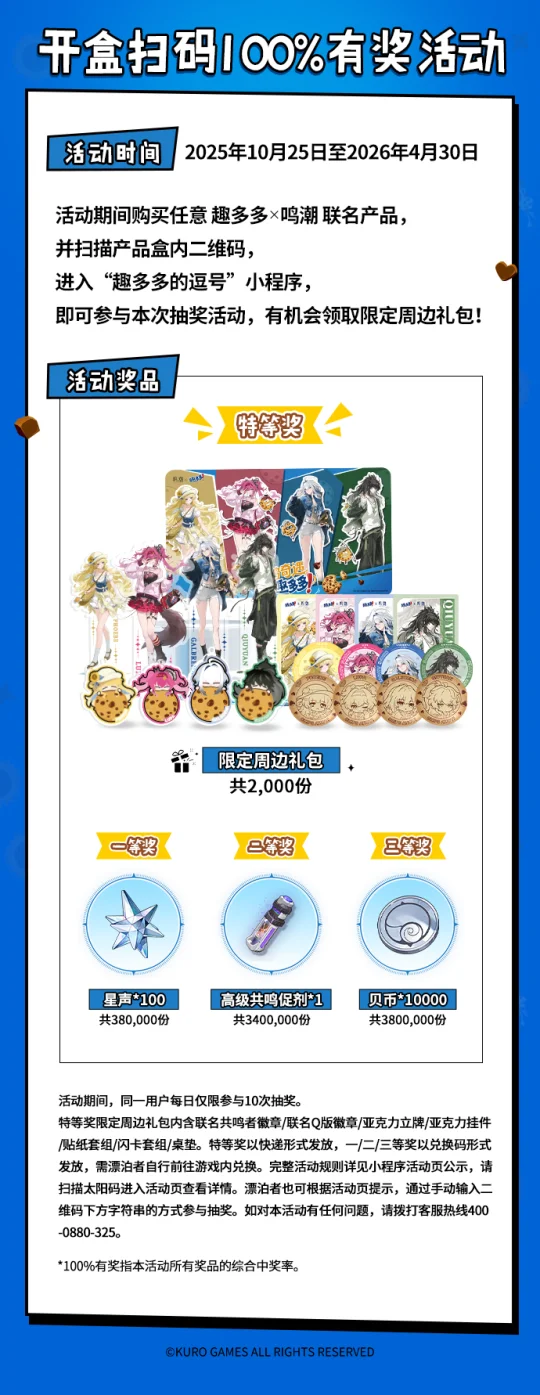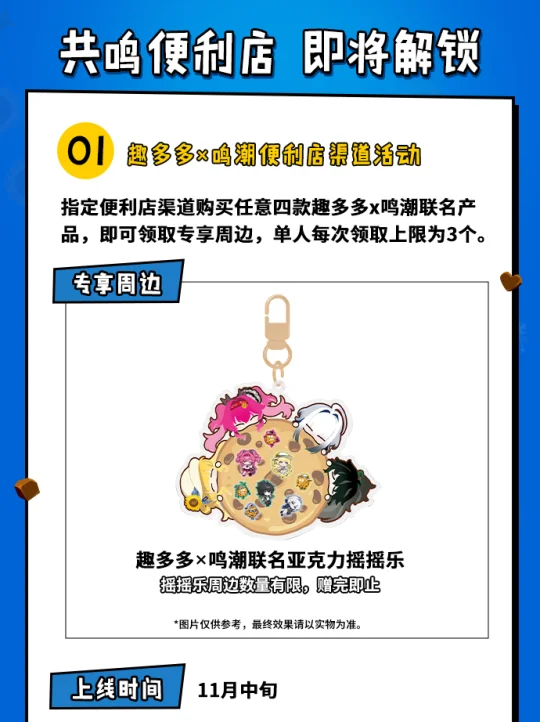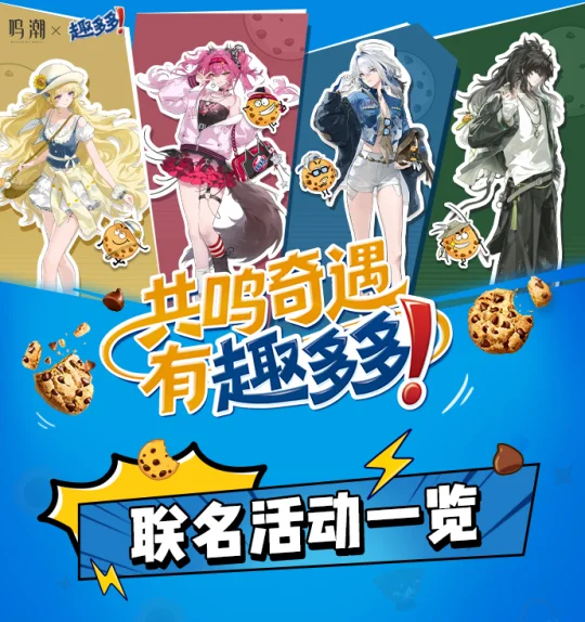鸣潮 × 趣多多 联名活动即将开启! 漂泊者们,准备好共赴这场充满逗趣的共鸣之旅了吗~ “咔嚓”一声,联名礼盒闪亮登场,内含美味曲奇和精美共鸣者周边! “咔嚓”两声,开盒扫码100%有奖,联名周边礼包和星声等奖励等你来领! “咔嚓”三声,线下巨幕大屏投放,快来和四位共鸣者&曲奇人相遇! “咔嚓”四声,共鸣便利店即将解锁,专享周边及联名主题包店不容错过! ※更多联动详细内容可点击图片查看。