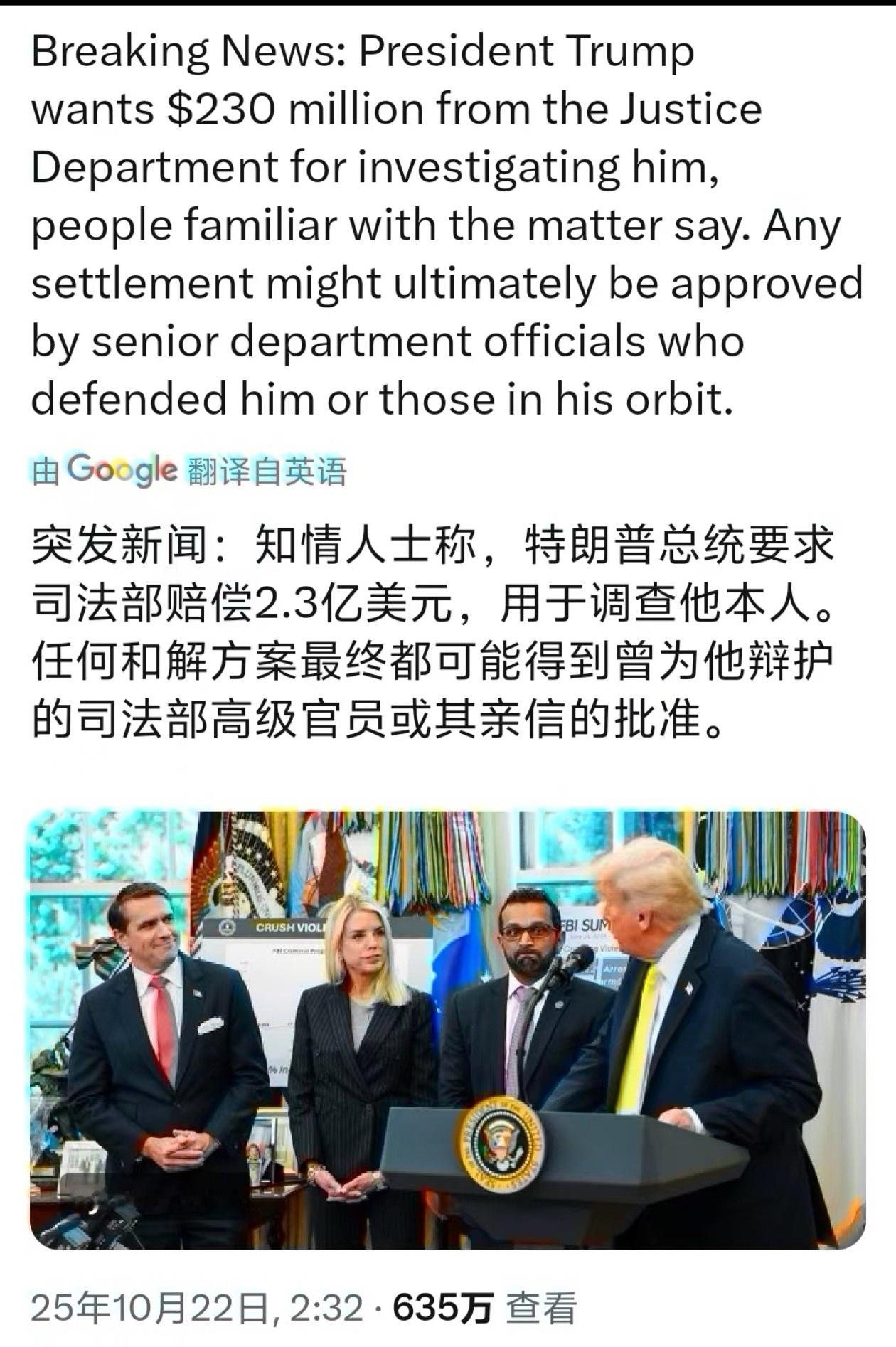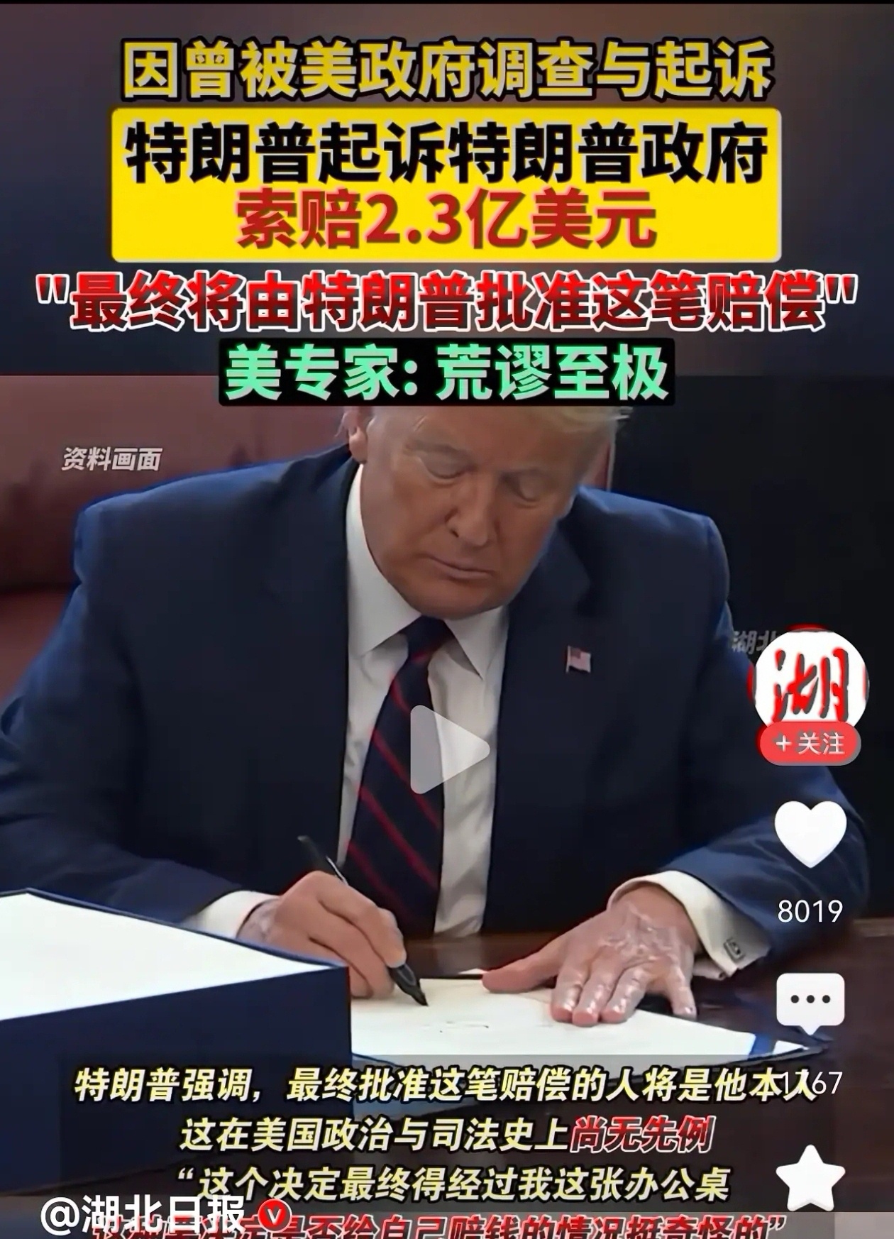 最魔幻的是最后这笔2.3亿美元,特朗普被拜登政府司法部调查起诉,现在他起诉要求他的司法部赔偿他2.3亿美元的“精神损失”,而司法部给的这笔赔偿,需要特朗普签字同意。