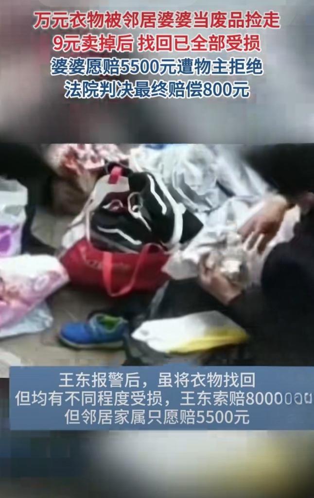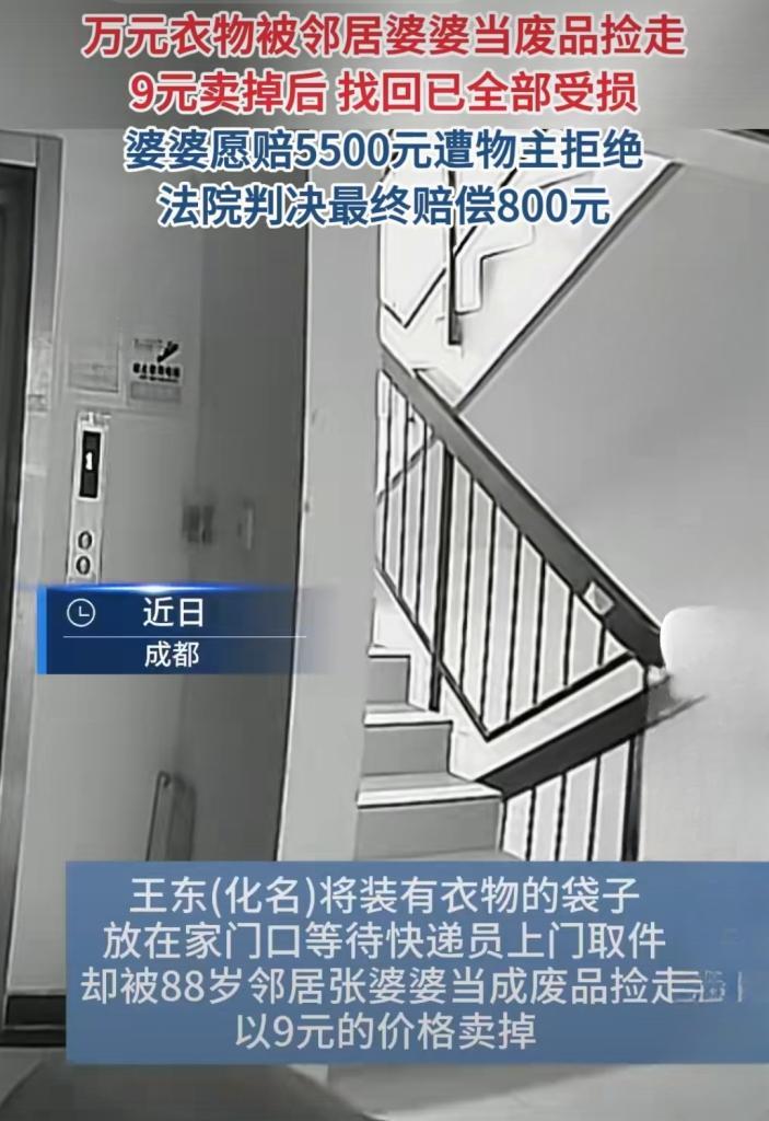 万元衣服9元被卖!法院判赔800元,这账算得明白吗? 成都小伙王东今年4月15日把待寄的衣服放家门口,转头就被88岁的张婆婆当废品捡走,9块钱卖给了回收站。里面有件3439元的始祖鸟冲锋衣、2199元的冲锋裤,总共值一万多。王东找着人后要赔8000元,对方只愿给5500元,谈崩后王东告了状,索赔超2.2万。9月18日开庭,法院最后判婆婆赔800元,儿媳很快就转了钱。 说到这个,我觉得法院这判决挺“会找平衡”的。我认为判决没按王东索赔的金额来,关键是考虑了“折旧”和“老人的实际情况” 。王东的衣服是2024年8月买的,到4月已经用了大半年,而且找回了5件,不能按全新价算。88岁老人收入通常不高,要是真判赔几千,可能会让她和家人压力太大。之前也有类似案子,比如有人误卖了别人的旧家电,法院也是按物品实际残值判的,不会让过错方承担超出能力的赔偿。 对了,还有个点有意思。我猜张婆婆一开始真没认出那是值钱的衣服 ,不然也不会只卖9块钱。她可能平时就有捡废品的习惯,把门口的袋子当成别人扔的垃圾了。这种“无心之失”和故意损坏不一样,责任认定上会轻一些。就像你不小心踩坏了别人的鞋,总不能让你按新品价全赔,得看鞋穿了多久、你是不是故意的。 你们觉得这800元的赔偿合理吗?要是你是王东,拿到这个结果会接受吗?