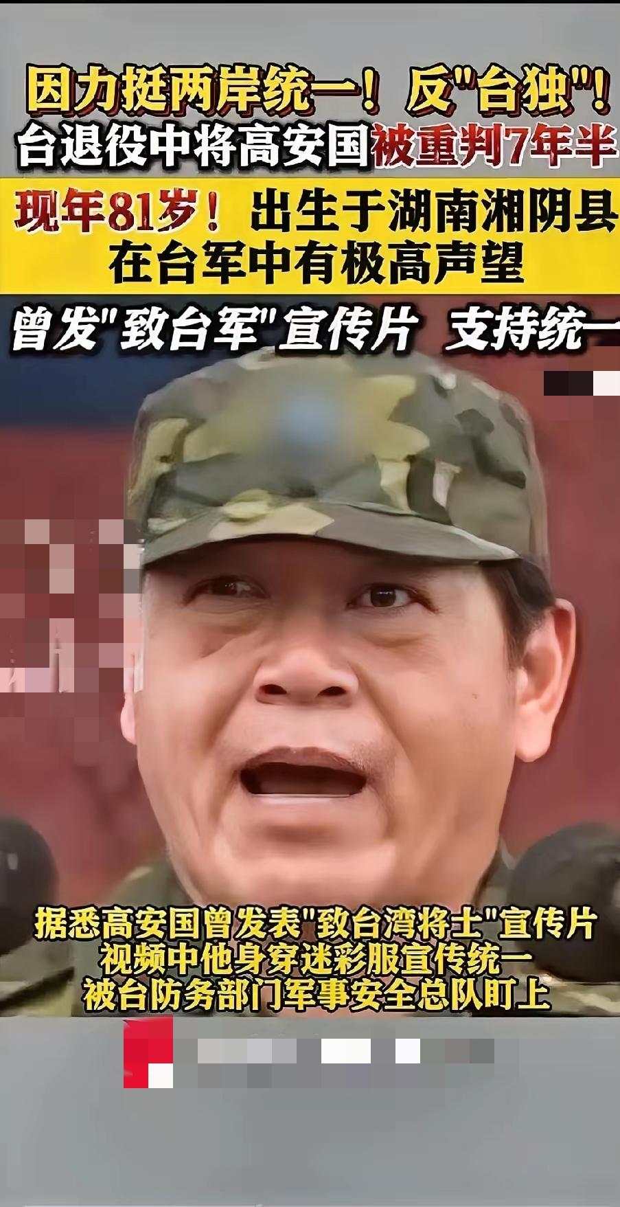 民进党当局这波操作,简直是把“色厉内荏”写在脸上!81岁的台退役中将高安国,就因为坚持爱国促统、反对“台独”,居然被他们判了7年6个月,还没收近30万财产,这哪是判案,分明是打压正义! 老话说“要想亡,先必狂”,民进党现在越是疯狂打压爱国人士,越说明他们慌了。嘴上喊着各种借口,实际就是为“台独”做最后挣扎,怕的就是越来越多台湾同胞认清他们分裂国家的真面目。 可他们忘了,统一是大势所趋,不是靠打压几个爱国人士就能逆转的。这种倒行逆施只会让更多人看清“台独”的危害性,反而加速他们的末日到来。 你们觉得,民进党这种疯狂操作,能挡得住两岸统一的脚步吗?评论区聊聊,看看大家怎么说!