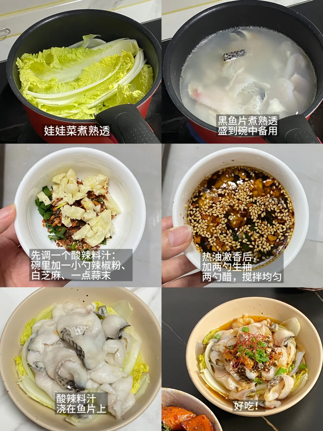 2)黑鱼片、娃娃菜煮熟透,浇汁开吃
