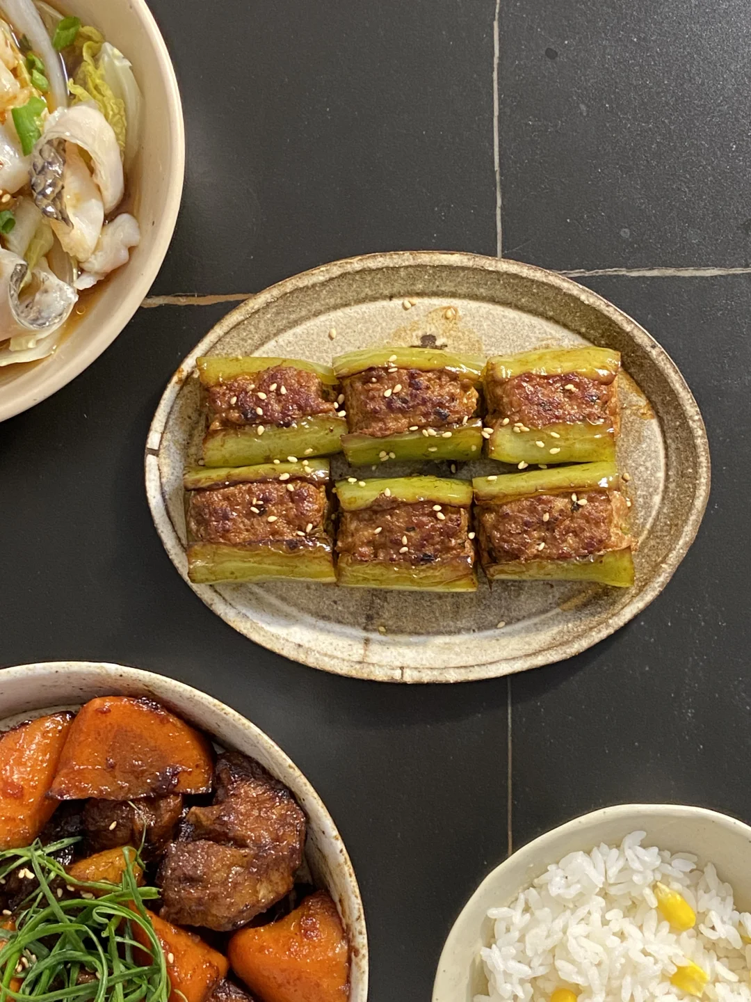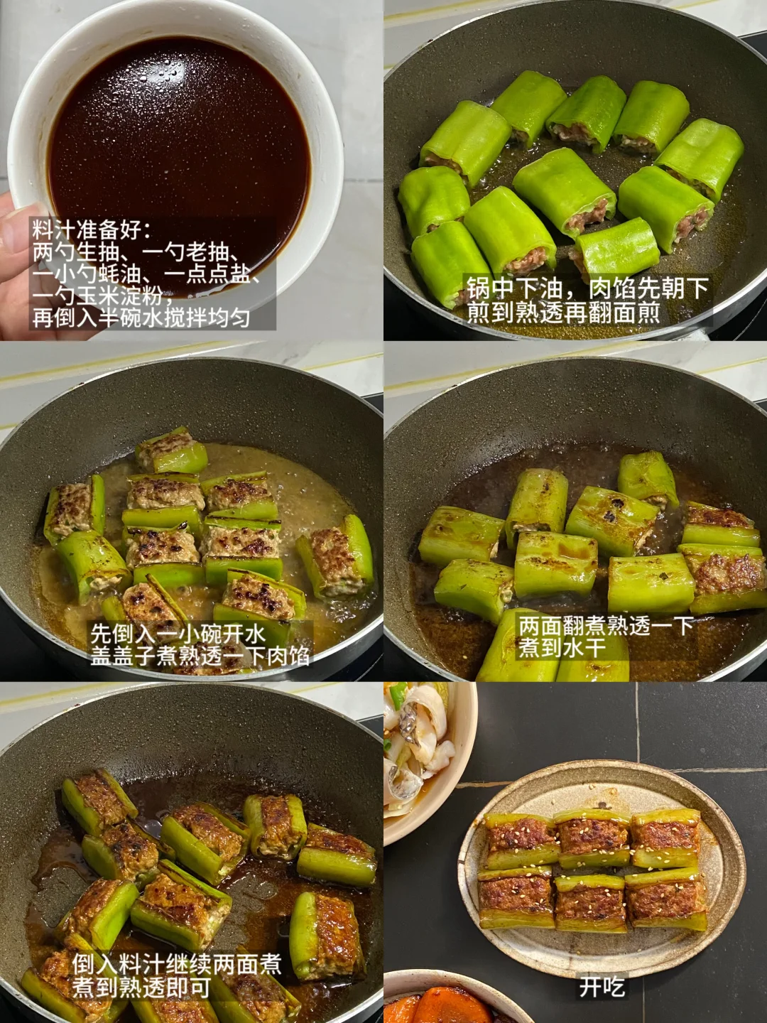 2)青尖椒切块,把肉馅挤入,锅中下油,肉馅先朝下煎到熟透再翻面煎,先倒入一小碗开水,盖盖子煮熟透一下肉馅,等水煮到快干后倒入料汁煮到收汁即可