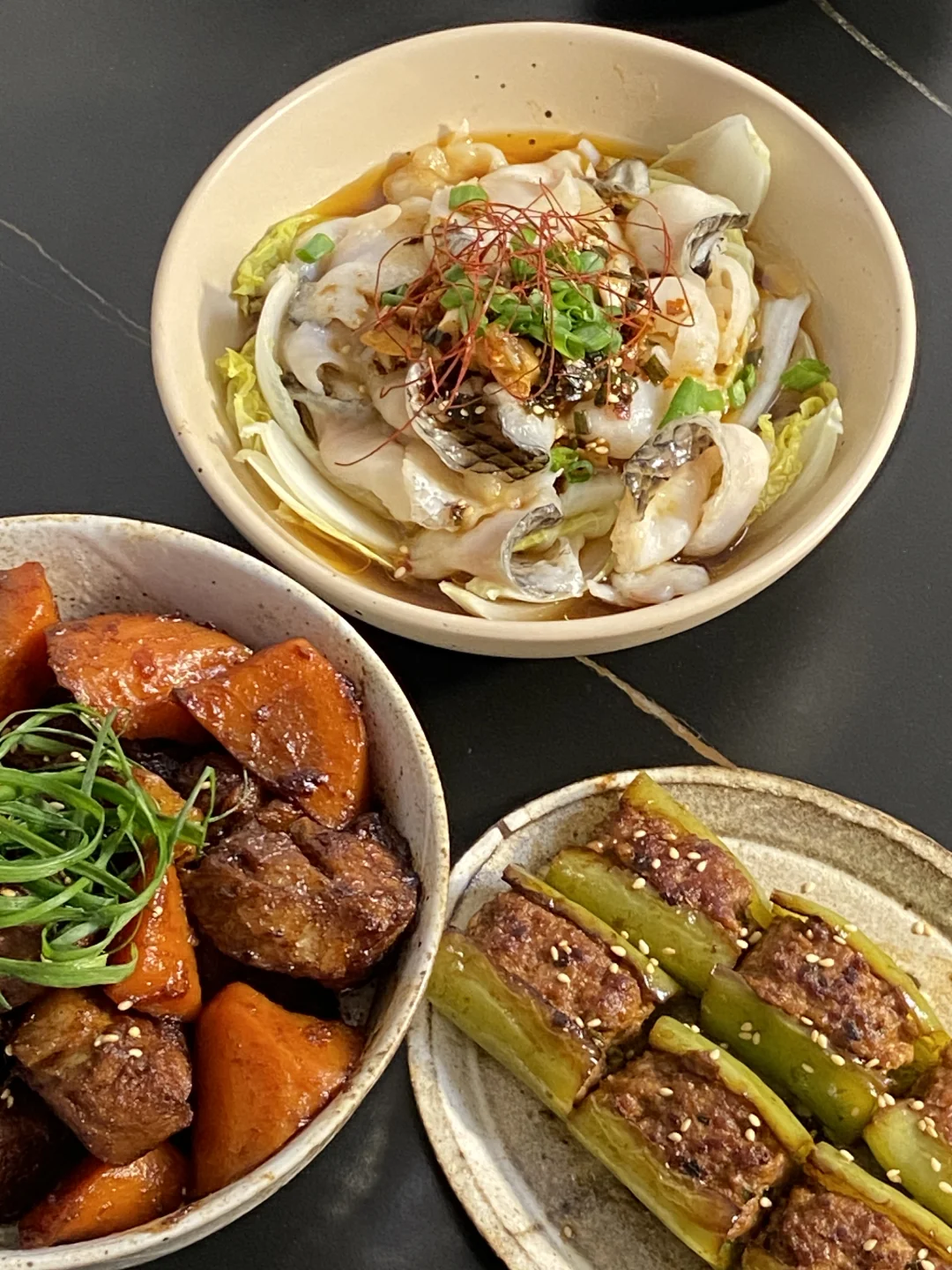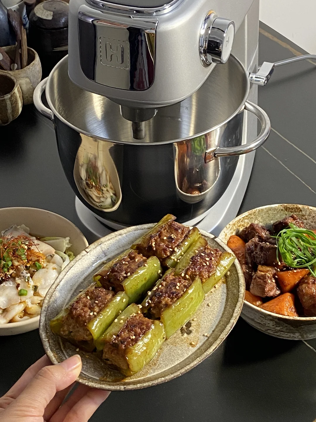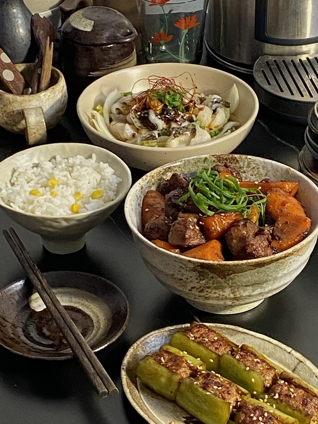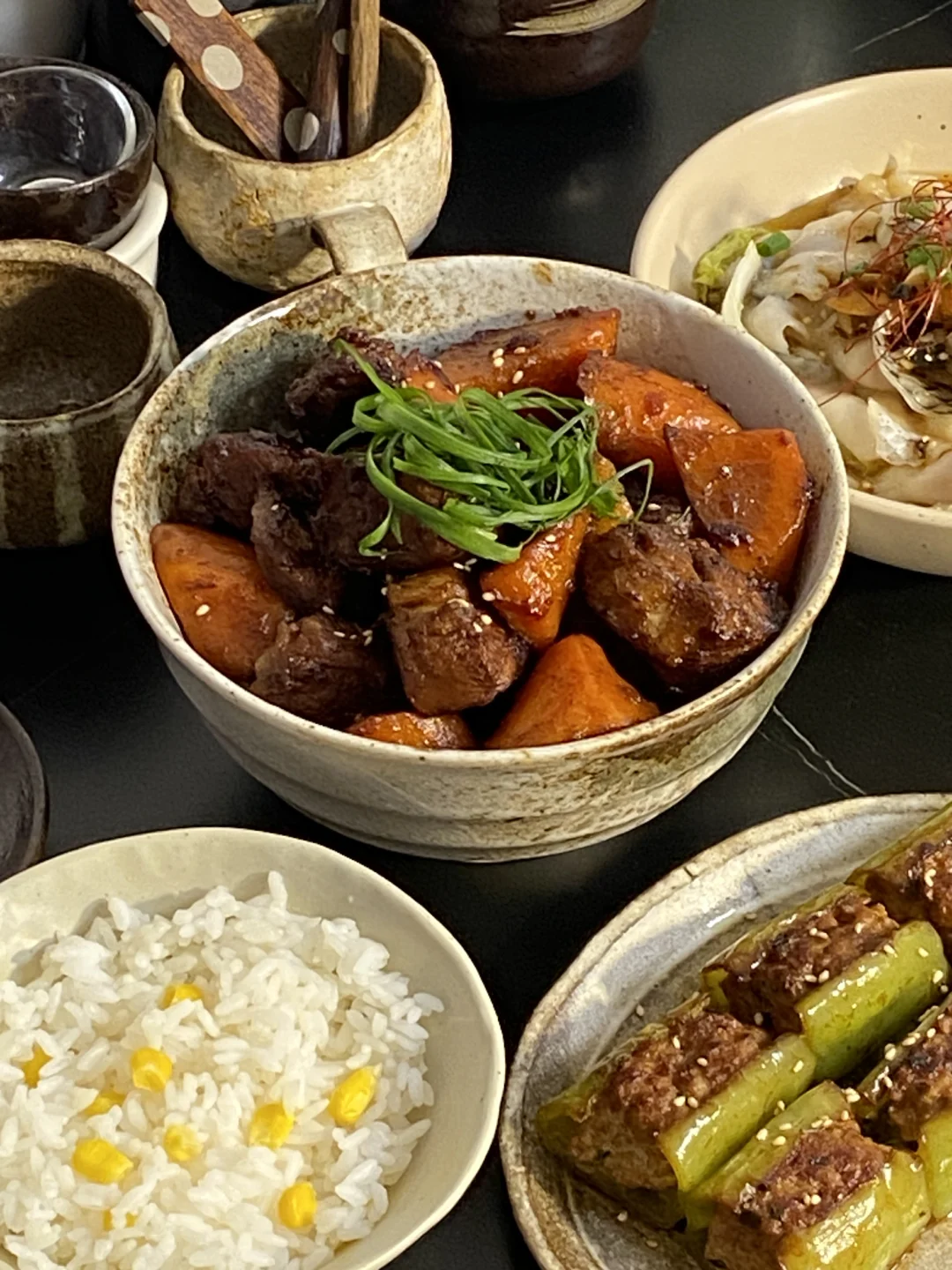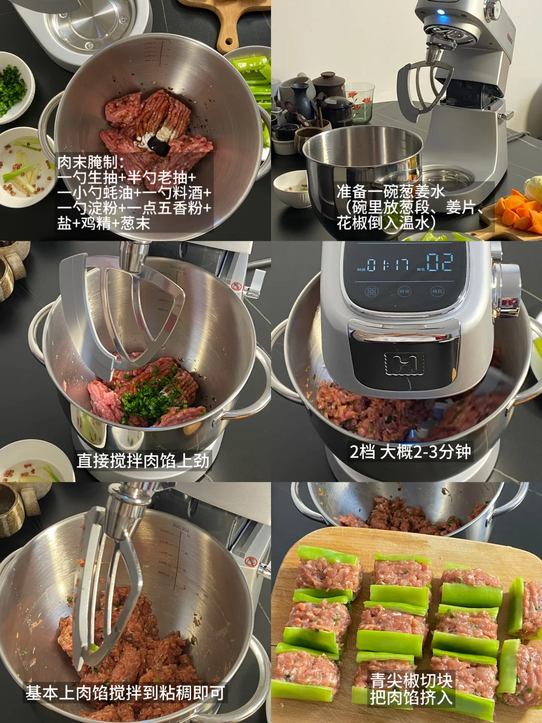 爱吃的家常菜谱,试了猪排和胡萝卜一起的做法,也很好吃,青椒酿肉也是常做的家常菜,调好肉馅直接煎就可以,今天的食谱如下: