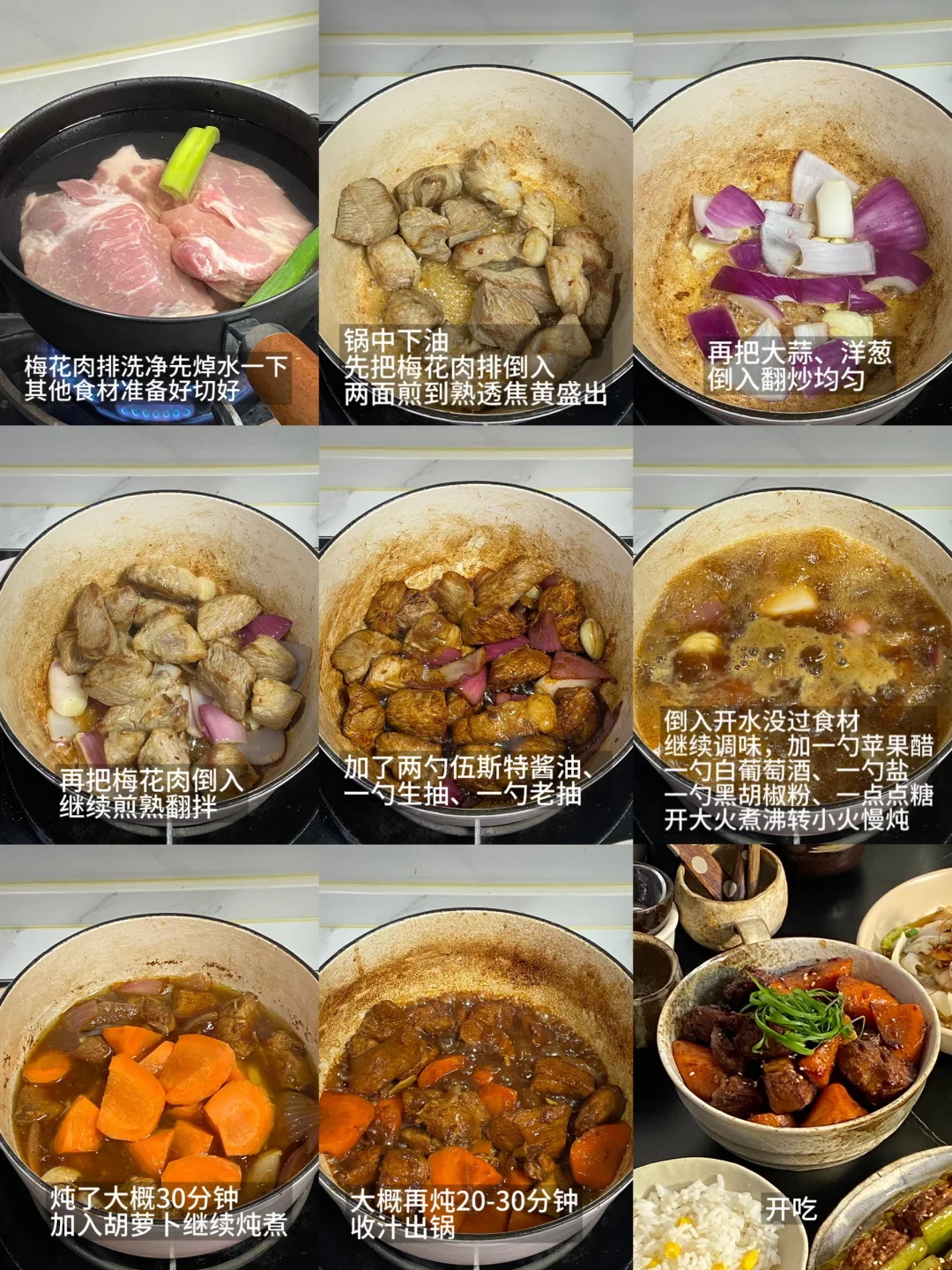 3)再把大蒜、洋葱倒入翻炒均匀,再把梅花肉倒入继续煎熟翻拌,加了两勺伍斯特酱油、一勺生抽、一勺老抽,倒入开水没过食材,继续调味,加一勺苹果醋、一勺白葡萄酒、一勺盐、一勺黑胡椒粉、一点点糖开大火煮沸转小火慢炖