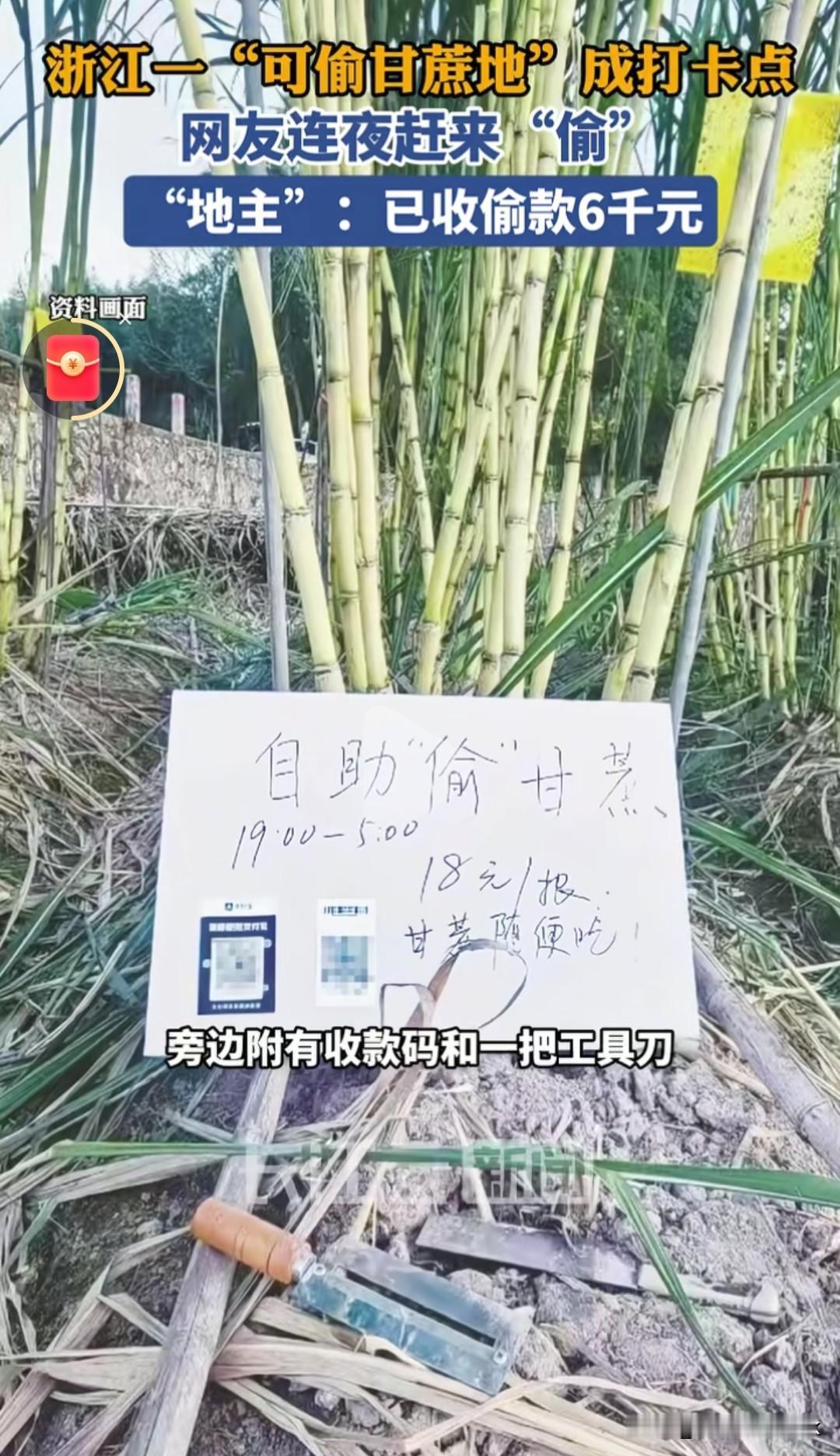 浙江一“可偷甘蔗地”成打卡点,网友连夜赶来“偷”,现场留有二维码和工具刀,只能晚上行动哦。 近日,浙江绍兴一块自助“偷”甘蔗的甘蔗地成打卡点。现场设有一张告示牌,一根甘蔗18元,甘蔗随便 吃,还留有付款二维码和砍刀,规定时间为晚上19点到第二天凌晨5点,让网友过一把小时候“偷”的乐趣。 还别说,这场信任的游戏开展20天以来,地的主人已收款6000元,地里还有1000多根,喊大家来“偷”。 甘蔗农是怎样想出这么绝妙的办法,既省体力,省时间,钱还没少赚的? 主人王勇龙说,他在网上发甘蔗熟了的视频,一名网友的话给了他灵感,“好久没有体验过小时候偷甘蔗的乐趣了,好想来一次”。 于是王勇龙就做了这个大胆的尝试,满足下网友的乐趣,没想到一下子还火了,一到晚上,付款码就响个不停,真是彼此心动的感觉。 有网友说,做了一次不用紧张的贼。也有网友说,这“偷”来的甘蔗嘎嘎甜。 满足了网友的乐趣,王勇龙心里也像吃了蜜一样甜,网友在评论区晒到手的甘蔗,他在评论区也收获了乐趣。 这是一场信任互动的游戏,主家不怕你真偷,随便吃,只想满足下网友小时候的乐趣;“小偷”不会让你输,信任回报的也是信任,怎能负你? 所以,做任何事要拿出真心,不怕输,你不负人,人必不负你!
