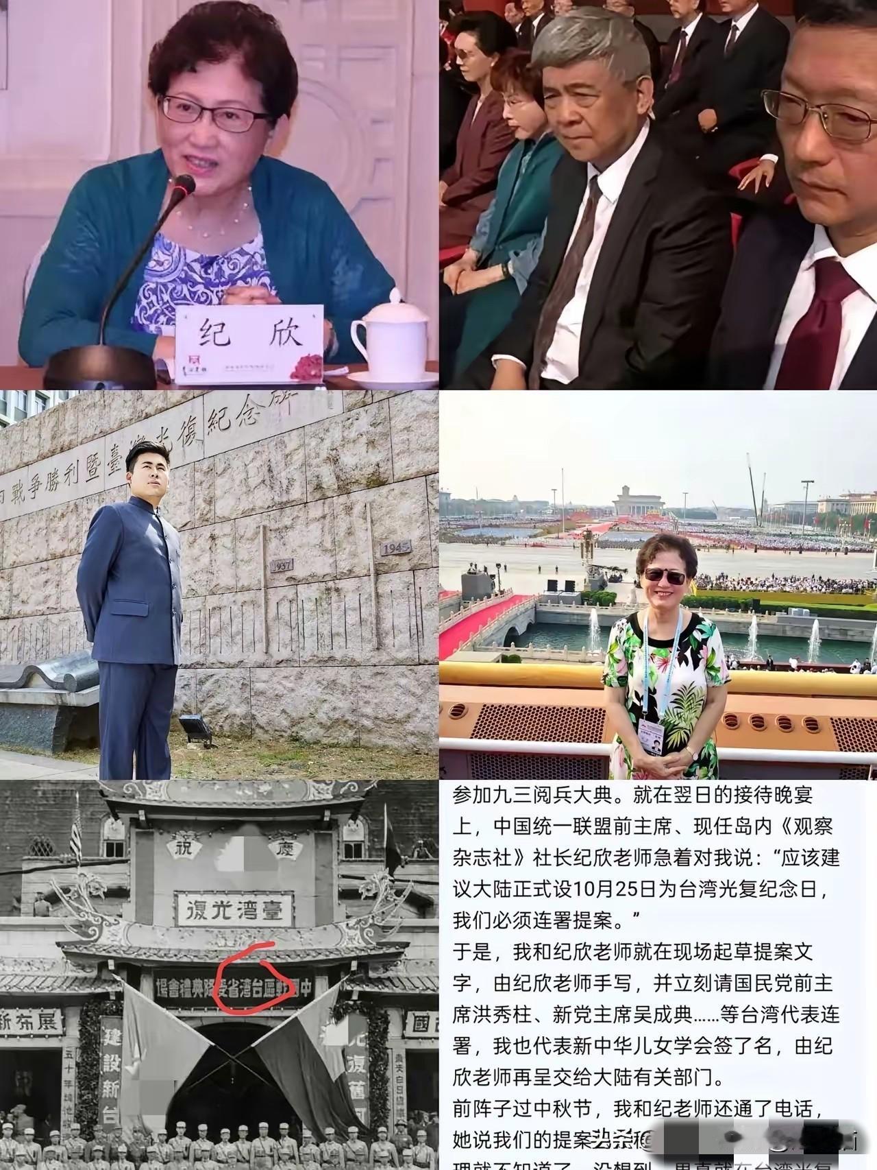 今天是10月25日,应该记住这些人的名字 他们是今天的纪念日提案人:纪欣、洪秀柱、吴成典、李胜峰、苑举正、吕礼诗、李尚贤、何鹰鹭、“范兰钦”郭冠英、王炳忠,李东宪、游智彬…… 他们是一群中华优秀的儿女,记住他们,记住今天。 王炳忠,在9月4日晚宴,纪欣找他现场写了提案,洪秀柱、郭冠英、苑举正等现场签了名,由纪欣进行了提交。 什么是赤子情怀,就是出力、流汗、奋斗、不懈努力,为了千秋万代,为了人民幸福,不计较个人得失。 这些名字或许不像明星那样家喻户晓,但每一个都刻着对家国的赤诚——他们来自台湾社会的不同领域,有学者、有媒体人、有政治活动家,却因为同一个信念走到一起:让两岸同胞共同铭记历史,让民族记忆不被时间冲淡。9月4日那场晚宴上的提笔、签名、提交,看似是简单的几个动作,背后藏着多少不为人知的坚持?要知道在当下的台湾,公开为两岸共同历史发声,难免会遭遇误解甚至攻击,但他们没有退缩,就像洪秀柱曾说的“为中华之崛起,我愿尽绵薄之力”,这份坦荡,正是赤子情怀最动人的模样。 纪欣女士多年来一直奔走在两岸交流一线,哪怕面对杂音,也始终坚定地说“两岸同属一中,这是不容置疑的历史事实”;苑举正教授作为学者,用通俗易懂的方式解读两岸历史关联,让更多台湾青年明白“我们的根在哪里”;王炳忠从年轻时就敢于站出来,为维护国家统一发声,哪怕遇到困难也从未动摇。他们不是在做“表面文章”,而是用实实在在的行动,一点点搭建两岸同胞心灵契合的桥梁——就像这次推动纪念日设立,不是为了追求个人名利,而是希望用一个特殊的日子,提醒所有人:我们同宗同源,共同的历史记忆,是两岸最珍贵的纽带。 有人可能会问,做这些事有那么重要吗?当然重要。这些年,台湾岛内一些势力刻意模糊历史、割裂两岸联系,甚至试图让年轻一代忘记自己的民族根源。而纪欣、洪秀柱他们所做的,就是在对抗这种“历史失忆症”。就像小时候家里长辈会给我们讲过去的故事,不是为了沉溺过去,而是为了让我们知道“从哪里来”,才能更清楚“往哪里去”。他们提案设立纪念日,本质上就是想当这个“家族里的讲述者”,把属于两岸共同的记忆传递下去,让千秋万代的中国人,都能记得我们曾携手走过的路,记得我们始终是一家人。 今天提起这些名字,不只是为了“记住”,更是为了看见一种力量——这种力量,来自于对家国的深爱,来自于不计个人得失的担当,来自于“为人民幸福奋斗”的初心。他们或许没有惊天动地的壮举,但每一次为两岸统一发声、每一次为历史记忆奔走,都是在为民族的未来添砖加瓦。这样的赤子情怀,值得我们每个人铭记,更值得我们传承下去——因为只有越来越多的人守护这份共同的记忆,两岸同胞的心才能贴得更近,民族的未来才能走得更稳。