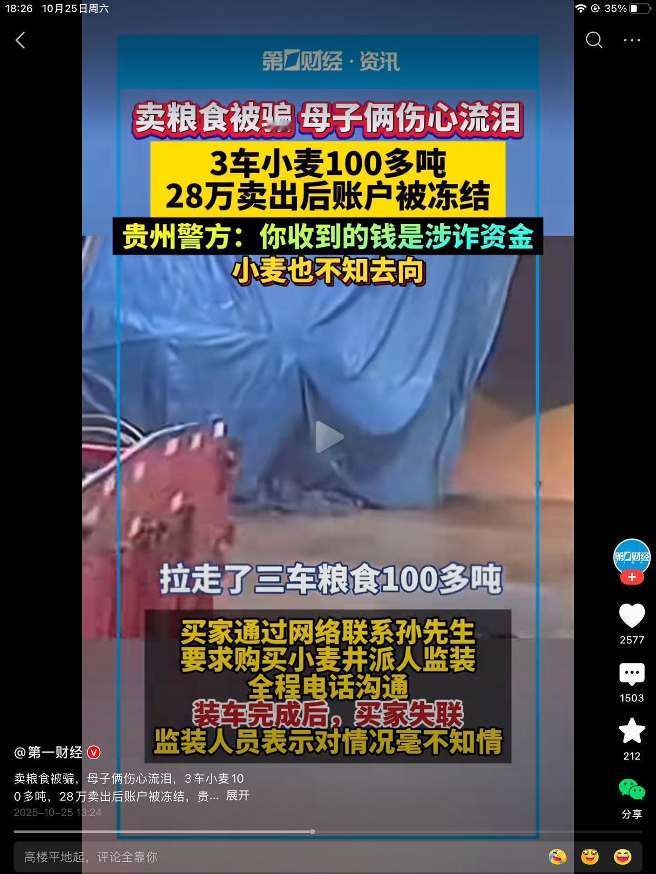 贵州母子买100多吨粮食被骗~收到的钱是涉诈资金。28万打到卡上以后银行卡就被冻。 流通以前的卡也不应该是正常的吧?等他把钱转出来以后才发现不正常吗?这事不该他们母子买单吧?! 问题是事已至此,谁来买单?三卡车麦子已经被拉走,不知去向。 天灾人祸,这叫什么,飞来横祸?看来以后要现金交易了。放在家里慢慢花。 我不怀疑这个事的流程,我只心疼这么多的收入,飞走了,谁能给管一管?