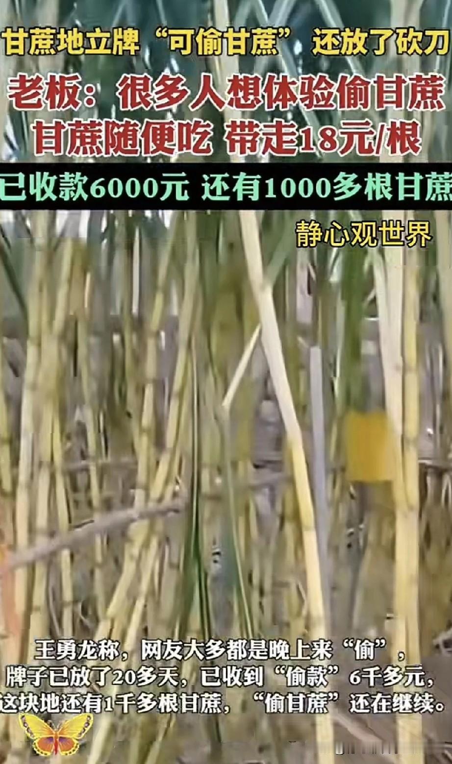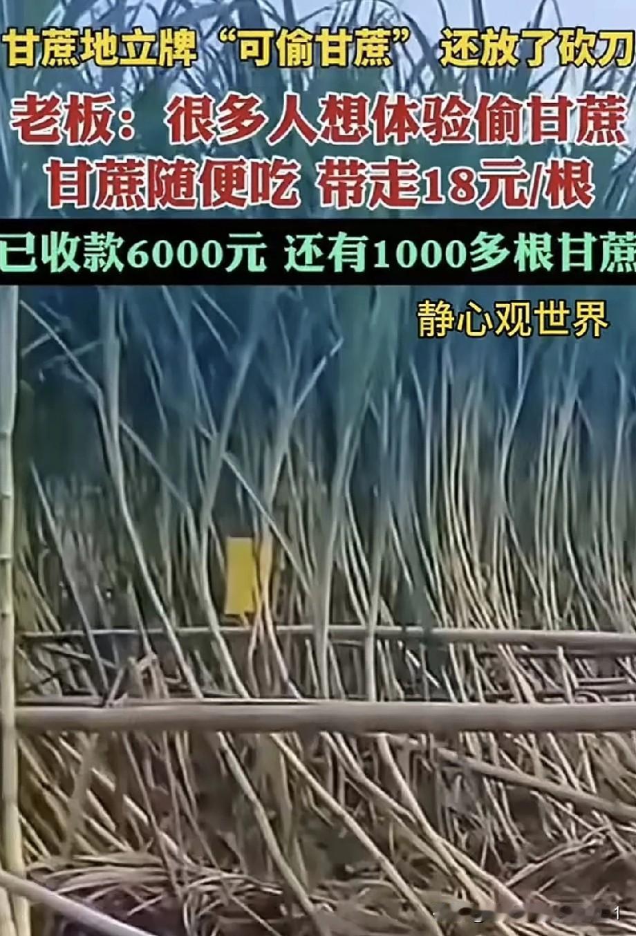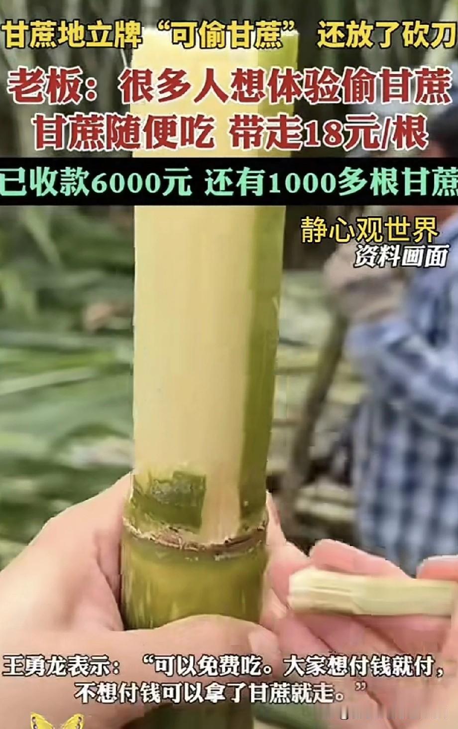 杭州一块甘蔗地旁立了块牌子,宣称可偷甘蔗,还备好了刀具。 甘蔗地主人此前在网上发布自家甘蔗成熟的视频,吸引了众多网友围观。有网友在评论区留言,称许久未体验小时候偷甘蔗的乐趣,很想再来一回。这话给了甘蔗地主人灵感,他便在甘蔗地旁立了个牌子,写着“自助偷甘蔗,随便吃,带走18元一根”,还留下了收付款码。这一举动再次引发路人关注,不少人都想体验偷甘蔗的乐趣,有很多人会把甘蔗带走。一些网友大多选择晚上来“偷”。 牌子立了20多天,目前已收款6000多元,地里还剩1000多根甘蔗。主人表示,大家可以免费吃,想付款就付,不想付直接拿甘蔗走也没人管,全凭自愿。不得不说,这主人太会做生意了,想法十分前卫,卖的就是体验。其实这种商业模式挺不错的。如今人们素质提高了,大多都会主动付款。在田里随便吃,吃好后想带走就付款,的确是种别样的体验。 这算拿这个考验人性吗?