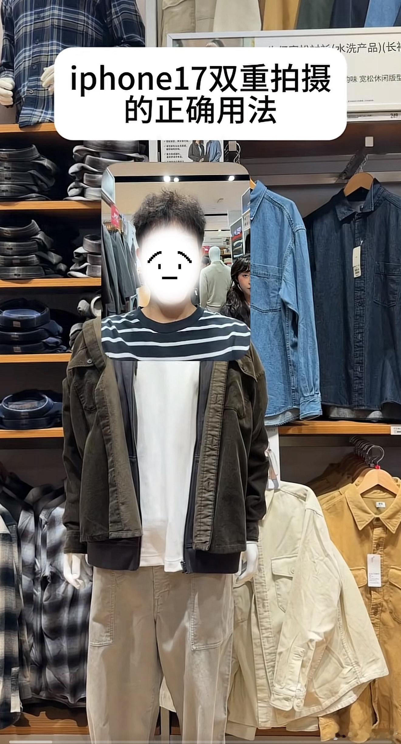 刷到一位网友用iPhone 17双重拍摄的天才妙用,不用亲自试穿就能看衣服适不适合自己,我勒个赛博购物啊[doge]