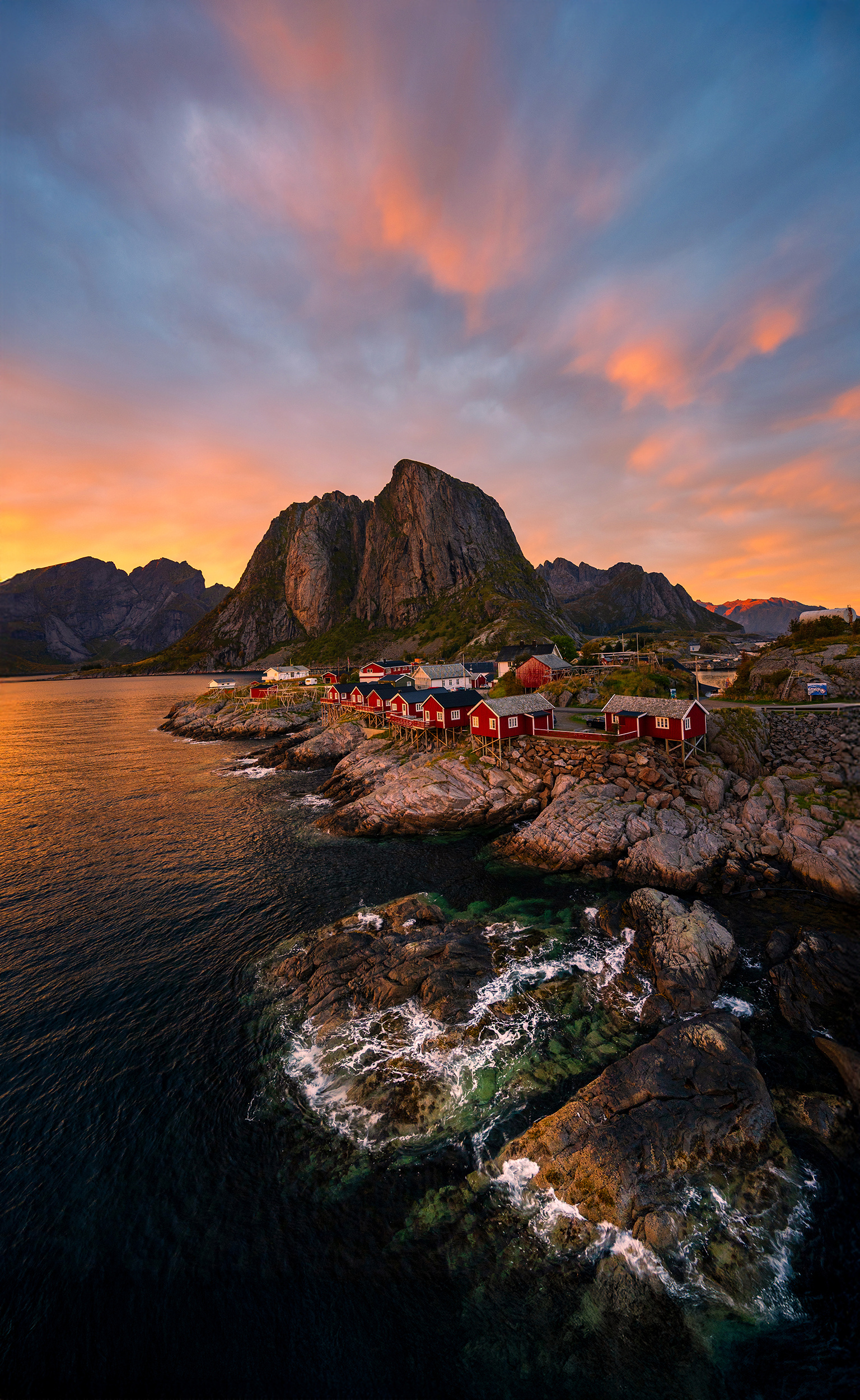 我们就住在罗弗敦的红色小屋中,一切都浸在熔金般的光里,海浪拍上岩滩,远山衔着最后一弯橙焰下沉,连呼吸都染上了挪威峡湾黄昏的浪漫。