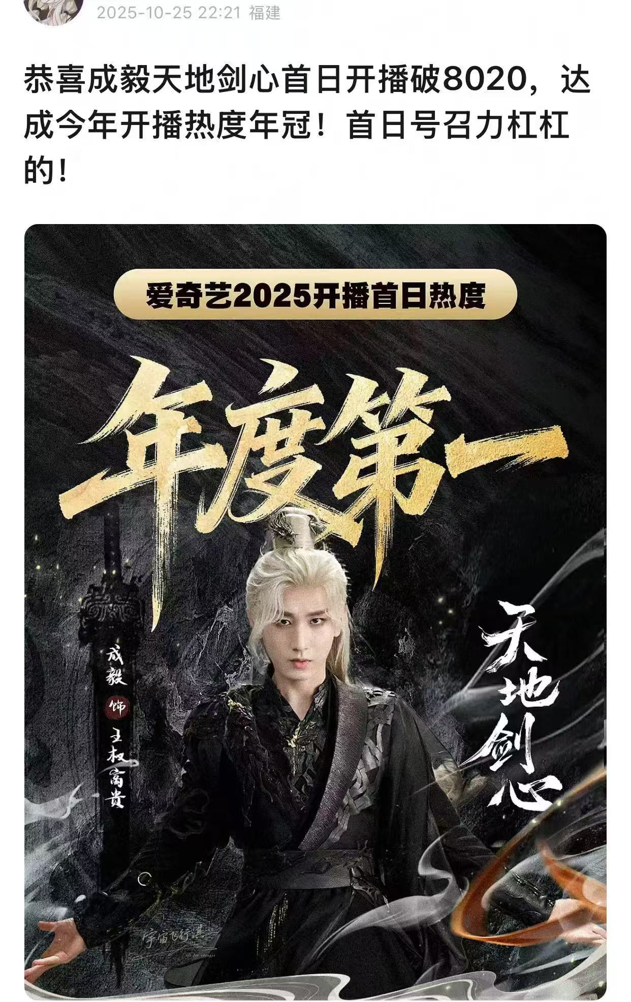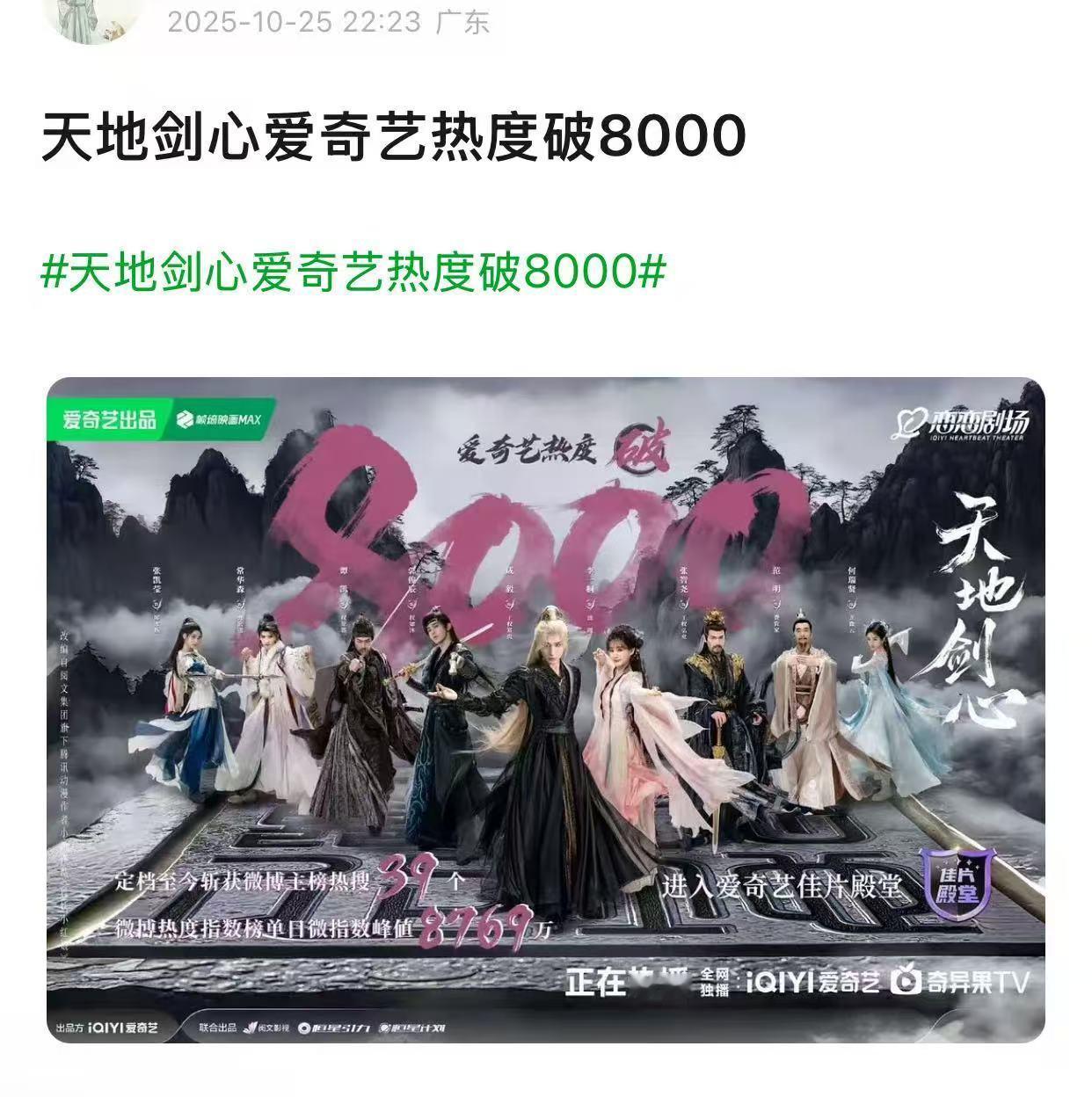 成毅主演天地剑心首日开播热度破8000了,照这个趋势走下去还挺好的,口碑不错,目前还全平台都在夸[耶]角色热度值也破了5亿,好剧多多发酵吧。