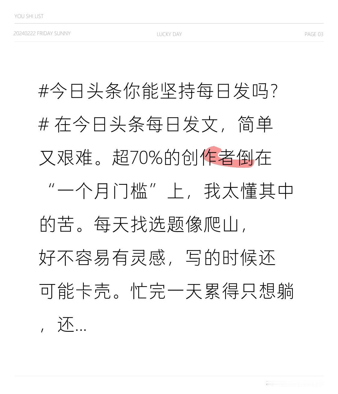 在今日头条每日发文,简单又艰难。超70%的创作者倒在“一个月门槛”上,我太懂其中的苦。每天找选题像爬山,好不容易有灵感,写的时候还可能卡壳。忙完一天累得只想躺,还得硬撑着敲键盘。 但我没停笔。日更让我写作技能提升,从表达生硬到能把小事写成故事。我把这里当成公开日记,记录美食、散步、烦心事。不在意爆款和阅读量,记录本身就有意义。 坚持日更的人目的不同,我只为不丢掉表达习惯。文字串起琐碎日子,让我看到生活闪光瞬间。只要生活继续,我就会写下去。