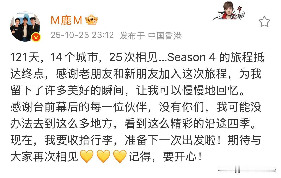 10月25日,鹿晗深夜发小作文,121天,14个城市,25次相见,感恩这一路相伴! 今年应该是鹿晗自从官宣跟关晓彤恋爱后,最努力工作的一年,所有的时间几乎都被巡演填满了,相比之前的佛系,事业心一下飙升,以前内娱只发现女艺人在遭遇情商后会突然变劳模,现在发现男艺人原来也会! 这样也挺好的,彼此在各自的世界里发光发热,摆脱了对方在自己身上得束缚,也减轻了舆论猜忌对自己的压力,活得更加肆意!