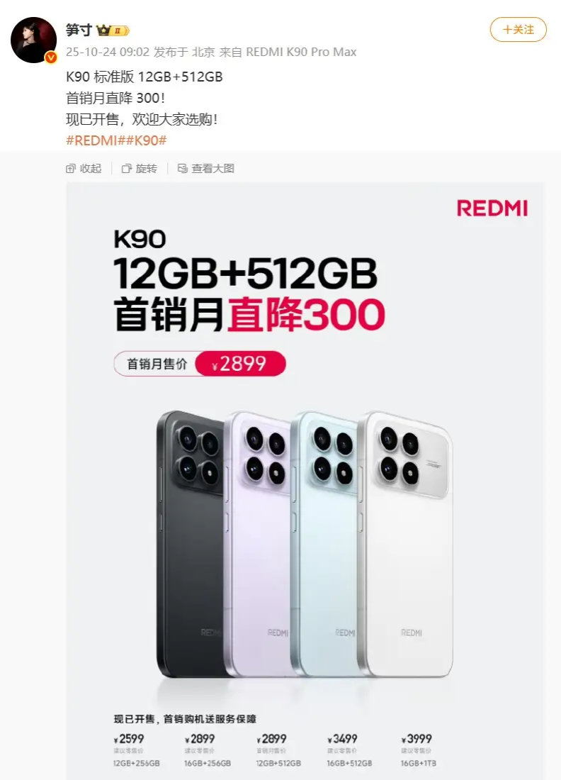 笋寸首先发布了 REDMI K90 标准版 12+512GB 配置首销降价 300 元的消息,随后在评论区表示:“我们无法改变全球供应链的走势,存储成本上涨也远高于预期,且会持续加剧。但我们希望这份诚意能够让大家理解”。