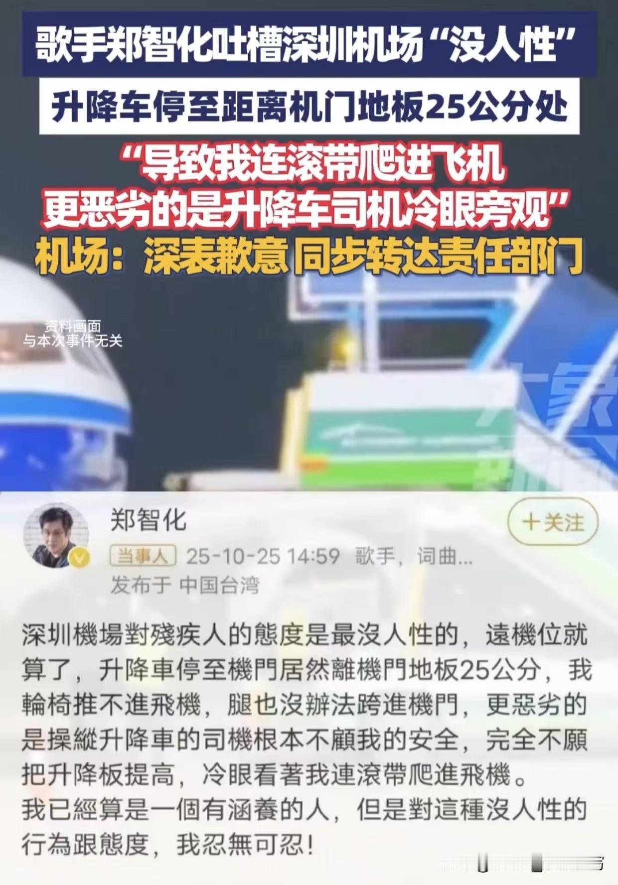 谁能想到,郑智化在深圳机场竟被“卡”在了25公分的距离里! 坐轮椅登机,升降车停至距离机门地板25公分, 他只能咬牙“连滚带爬”上去,司机却冷眼旁观,啥也不做。 太让人心寒了! 这可是深圳啊,全国数一数二的大城市,怎么对残疾人这么没温度? 连明星都这样,普通人还怎么活? 这哪是差25公分,分明是差了那份尊重和体面! 城市发展再快,也不能把人性甩在后面。 机场是城市的脸面,别让冷漠伤了人心。 这事必须重视起来! 感觉这种情况一定要整改,为公平和尊严发声, 城市要有温度,要给残疾人带来方便。 机场这种情况,你觉得应该整改吗? 对此你怎么看?