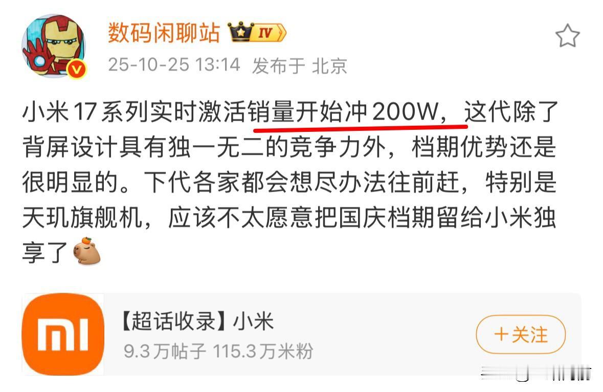 小米17系列实时激活量都开始冲200万大关了,这才上市一个多月啊,比上一代半年的销量跑得都快!只能说,这次小米是把天时地利人和全占了。 先说最戳人的妙享背屏”,这绝对是今年手机圈的王炸设计。花10个亿砸出来的2.66英寸小屏幕,真不是噱头,做饭时双手油腻,轻点背屏就能接电话;用主摄自拍时,背屏能实时预览构图,再也不会拍出闭眼废片;甚至能直接显示小米汽车的电量和位置,妥妥的“人车家”生态控制中枢。这种把实用性和趣味性拉满的创新,市面上真是独一份,好多人就是冲着这背屏果断下单的。 更绝的是小米的档期选得太精明了!9月底发布,刚好卡在国庆黄金周之前,前避华为后避苹果,直接把国庆档变成了自己的“独享主场”。想想国庆大家换手机的需求爆发,市面上能打的旗舰就它一个,销量能不爆吗? 不过我猜,其他厂商这次肯定看明白了。下次绝对不会让小米独吞国庆档红利,尤其是天玑旗舰机,毕竟vivo、OPPO都已经有天玑9500的机型在路上了,下代说不定会集体往前赶档期。 说真的,小米17能卖这么好,核心还是产品硬。除了背屏,还有骁龙8 Elite Gen5芯片、7000mAh大电池、徕卡三主摄这些配置,关键还“加量不加价”,4499元起的价格确实能打。