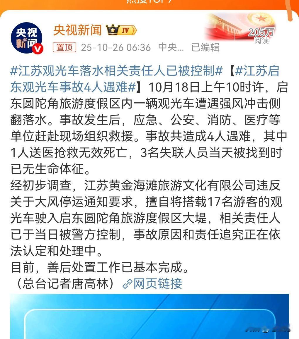 这真的是太悲剧了,人生总是那么的充满不确定性。 所以人生要及时行乐啊。 这真的是非常的有道理啊。 近日,江苏启东观光车事故4人遇难,这真的是太可惜了。 想不到有那么大的风,竟然能把车弄进水里。 有大风本应该停运。然而却继续营业,那这个负责人必须负责。 责任人已经被控制,这也敲响了警钟。