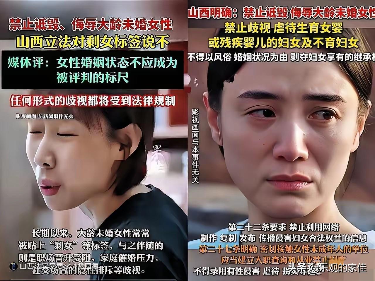 山西的这条新法规,给所有女人提了个醒。 不是因为法律多了几句禁止,也不是因为网上吵得热闹,而是它明明白白地告诉你:你的价值,不该被“嫁没嫁人”这句话框住。 以前总有人把“剩女”挂在嘴边,好像年纪大了没结婚就是失败。现在法规直接认定这种标签是诋毁和侮辱。这层意思,比催你结婚重要得多。 它提醒我们,日子是自己过的。选择读书、工作,或者选择单身,都不是错。法律站出来,不是要管住谁的嘴,而是护住每个人选择生活的底气。 所以,这条法规更像一面镜子。照出那些老观念该变变了,也照出女人自己得先看得起自己。