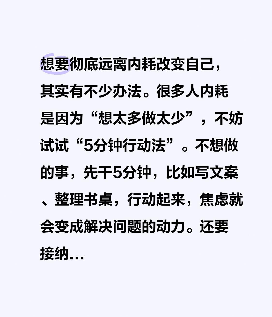 想要彻底远离内耗改变自己,其实有不少办法。 很多人内耗是因为“想太多做太少”,不妨试试“5分钟行动法”。不想做的事,先干5分钟,比如写文案、整理书桌,行动起来,焦虑就会变成解决问题的动力。 还要接纳“不完美”。别总抱着“必须做到最好”的执念,工作没满分下次改进,和朋友拌嘴允许磨合,对自己说句“我尽力了”,放过苛责的自己。 学会“课题分离”也很重要,分清“自己的事”和“别人的事”,别人的评价不用太在意。另外,养成钝感力,别过度解读外界声音,像网友@雪饼,不再过度关注外部评价后,工作和生活都变好了。