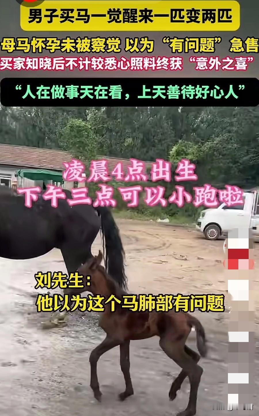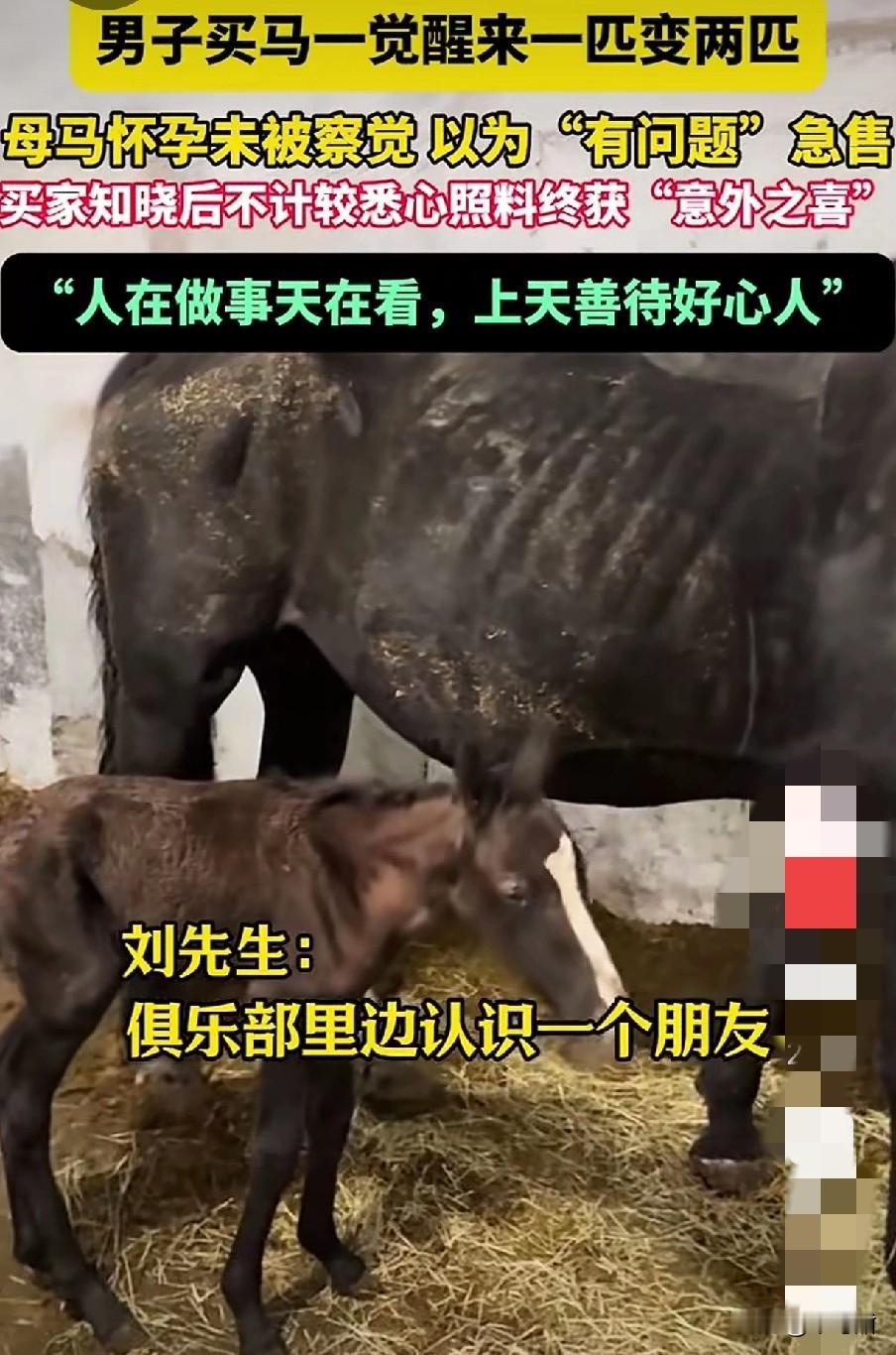 真是善有善报啊,一个人的善良确实会带来福运。 近日一男子发视频,很喜悦的和大家分享他买了一匹马,可没想到一匹马变成了两匹马的快乐。 原来在某俱乐部,他认识了一位同样喜欢养马的朋友,聊到他有很多马,有一只身体不怎么好,愿意低价出了。 男子也接受了马身体不是很好,把马买回家悉心照顾,可没想到,回家没多久,这马居然生了一匹小马,原来,人家哪是生病了,这是怀孕了,但没被马主人发现,以为它肺部有问题,跑一会就踹气,就不想要了。 买到马的男子实在太开心了,因为一次善良得到了福报,估计这会原主人也有点后悔了吧,没想到自己的马会怀孕了,就着急卖掉。现在被买一送一,实在让人惊喜啊。