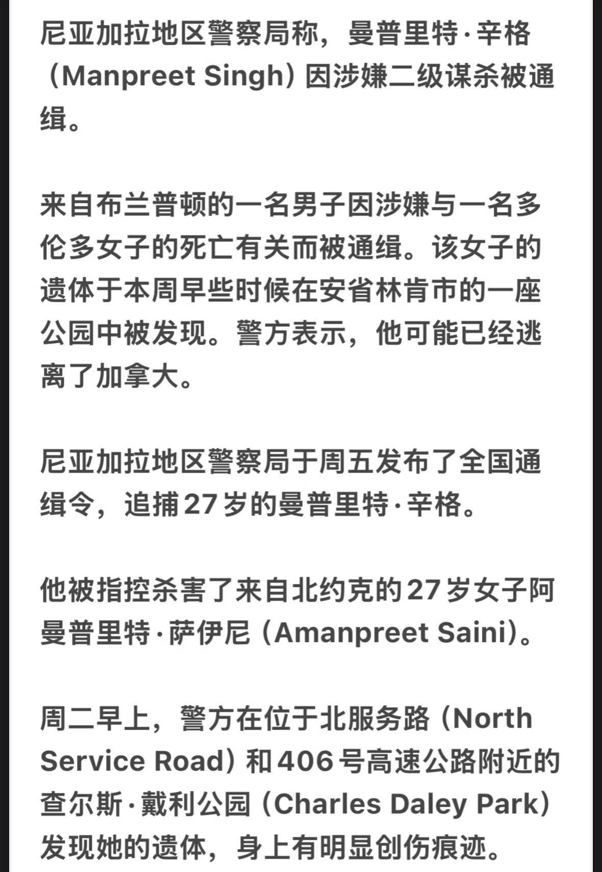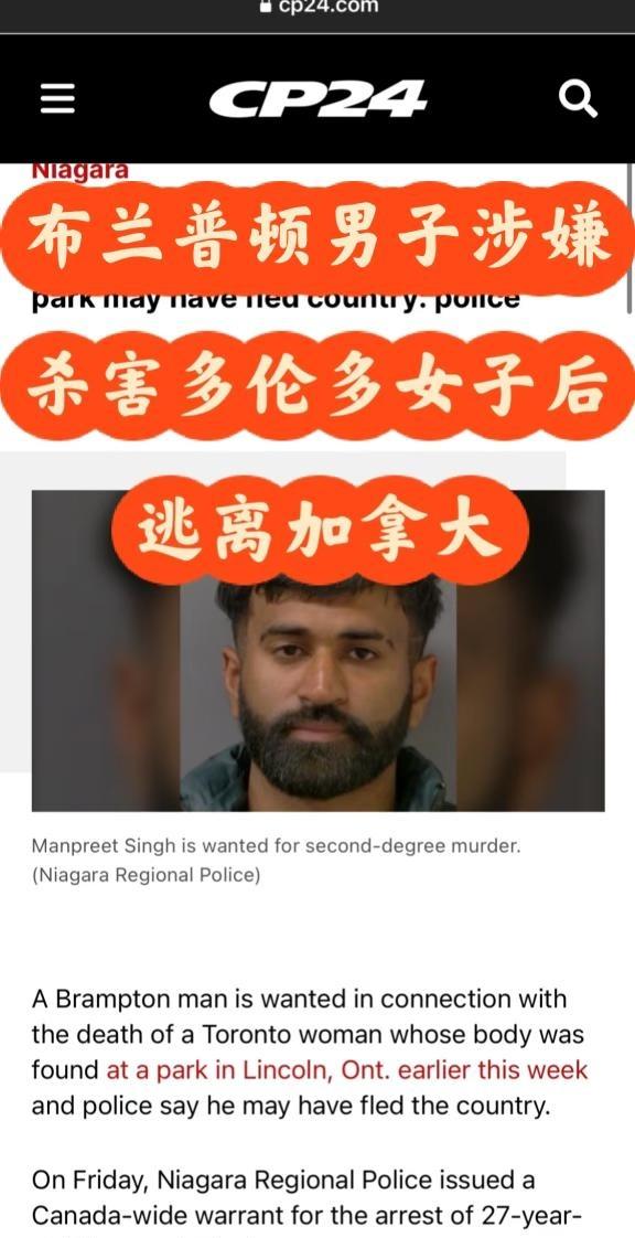 布兰普顿男涉嫌杀害多伦多女子后逃离🇨🇦 事发地点在安大略尼亚加拉的一个湖边公园加拿大 女生要注意安全布兰普顿 安省 尼亚加拉