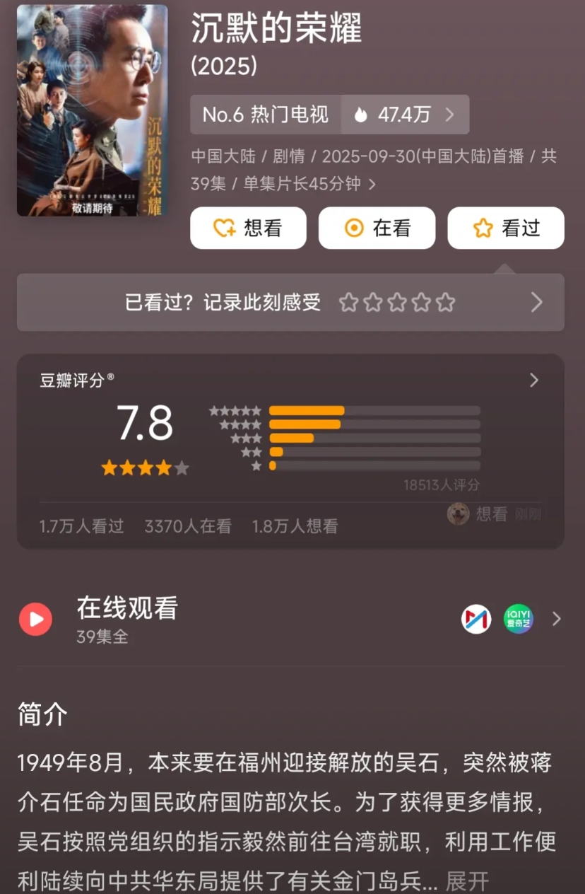 《沉默的荣耀》豆瓣评分出来了,7.8分,真是让人大跌眼镜。