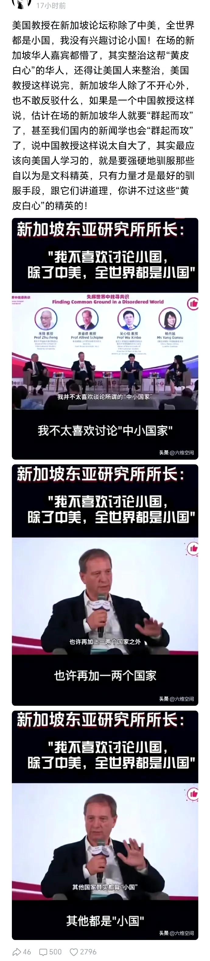 坡县人又被上了一课。这回给他们上课的老师是美国人。 一美国教授在新加坡论坛上发言时称除了中国和美国之外,全世界其他国家都是小国,我没有兴趣讨论小国。 此言一出,在场的坡县人都懵逼了,他们根本没有想到,美国人的眼中从来没有坡县!而他们请这个教授来的目的,就是想听听他对坡县有什么看法和好的建议。他们哪里想到这个美国人会搞这么一出。 现场顿时一片尴尬。坡县那些参加论坛的嘉宾,脸上红一阵白一阵,恨不得找个地洞钻进去。即便如此,这些人还是硬着头皮听完了这个教授的发言。 整治这群黄皮白心的华人,还得让西方人来,特别是美国人。 美国人这样公开说,坡县人除了内心很不开心之外,根本不敢再表露什么出来。 如果说这话的是个中国教授,估计当时在场的坡县人就会群起而攻之,甚至会马上把他赶下台来。 坡县之所以如此感觉良好的原因,我感觉主要还是东大对它过于客气了。东大素质太高,讲究礼仪,从而让一些阿猫阿狗自我定位都不清晰了。这是好事还是坏事呢?