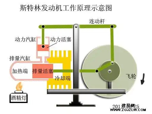 什么叫斯特林发动机?它有两个特点,一是“外燃”,二是“闭式循环”。如图,外燃就是下面有个酒精灯之类的东西在烧;闭式循环是说,一定量的工质(氦/氢/空气)永远封死在机器里,只在‘热腔'与‘冷腔’之间来回跑,热量从外部透过缸壁进来、出去,而气体本身既不烧掉也不更换。