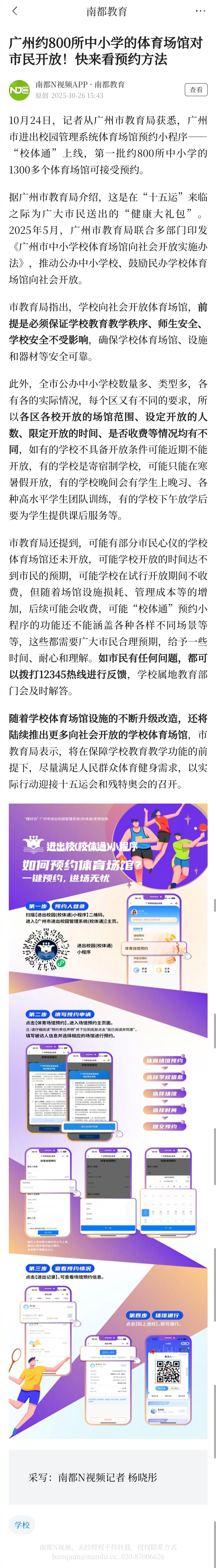 #广州800所中小学体育场馆对外开放#【广州约800所中小学的体育场馆对市民开放!快来看预约方法】#广州1300多个校园体育场馆开放预约#10月24日,记者从广州市教育局获悉,广州市进出校园管理系统体育场馆预约小程序——“校体通”上线,第一批约800所中小学的1300多个体育场馆可接受预约。