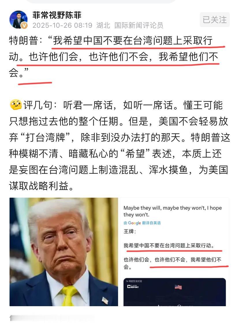 这才是懂王对台湾的真实态度,他也是想拖,真正采取了行动,大漂亮也头大,西边有个乌克兰,中东有个以色列,这边再火烧眉毛,超级大国也分身乏术。