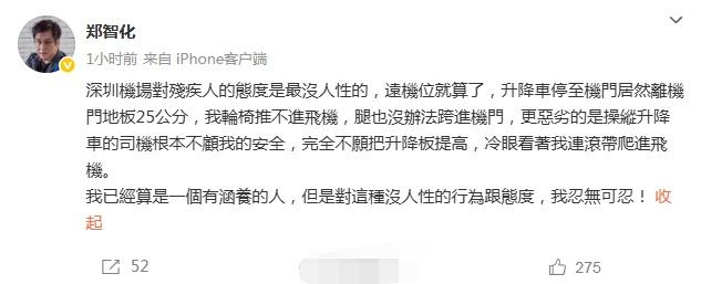 这些年来台湾同胞被祖国大陆给惯坏了宠坏了!绝不相信他是连滚带爬这么夸张这么屈辱的进的飞机,服务再差也不可能连滚带爬进飞机,何况深圳机场的整体服务做得已经相当好了,即便被人如此夸张的“批评”也在第一时间做出了回应表达了歉意!现实中其实也不乏这样的人:你对他十次的好他可能永远记不住,但凡哪怕有一次稍微不如其意,他倒是记得很清楚!幸好有调查视频,否则深圳机场就真的被一面之词被众多网民给冤枉了!