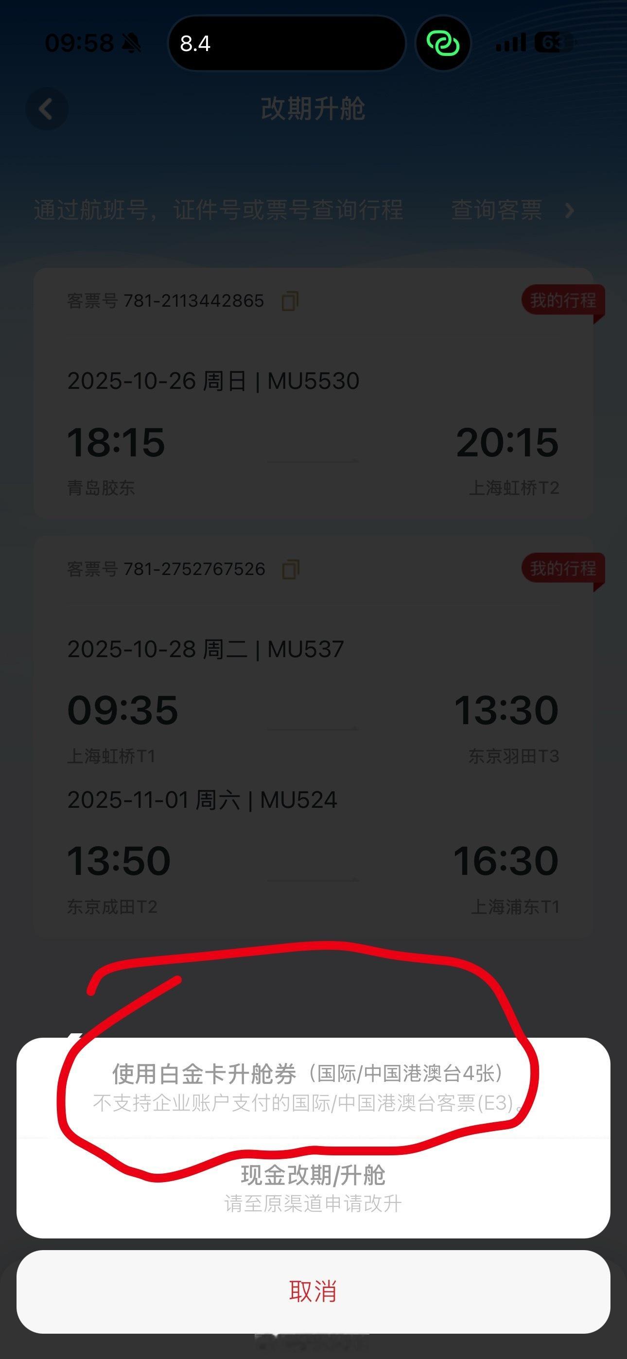 飞日本的航班想用白金卡升舱,也不枉飞了一年的牛马航班攒出的白金卡发挥价值,谁知道提示企业账户订票不能升舱。