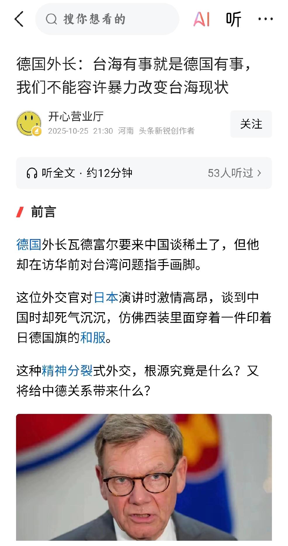 德国:教训 个人观点:中德贸易超2500亿欧元。可是德国外长一边在欧盟对中国电动车加征关税,一边还想来中国谈合作。德国这位外长在挑衅中国的底线。明明知道台湾问题,是中国的底线,可是还在明知故犯,蓄意挑拨。 搬起石头,狠狠的砸自己脚,自己把门关上了,还指责别人。