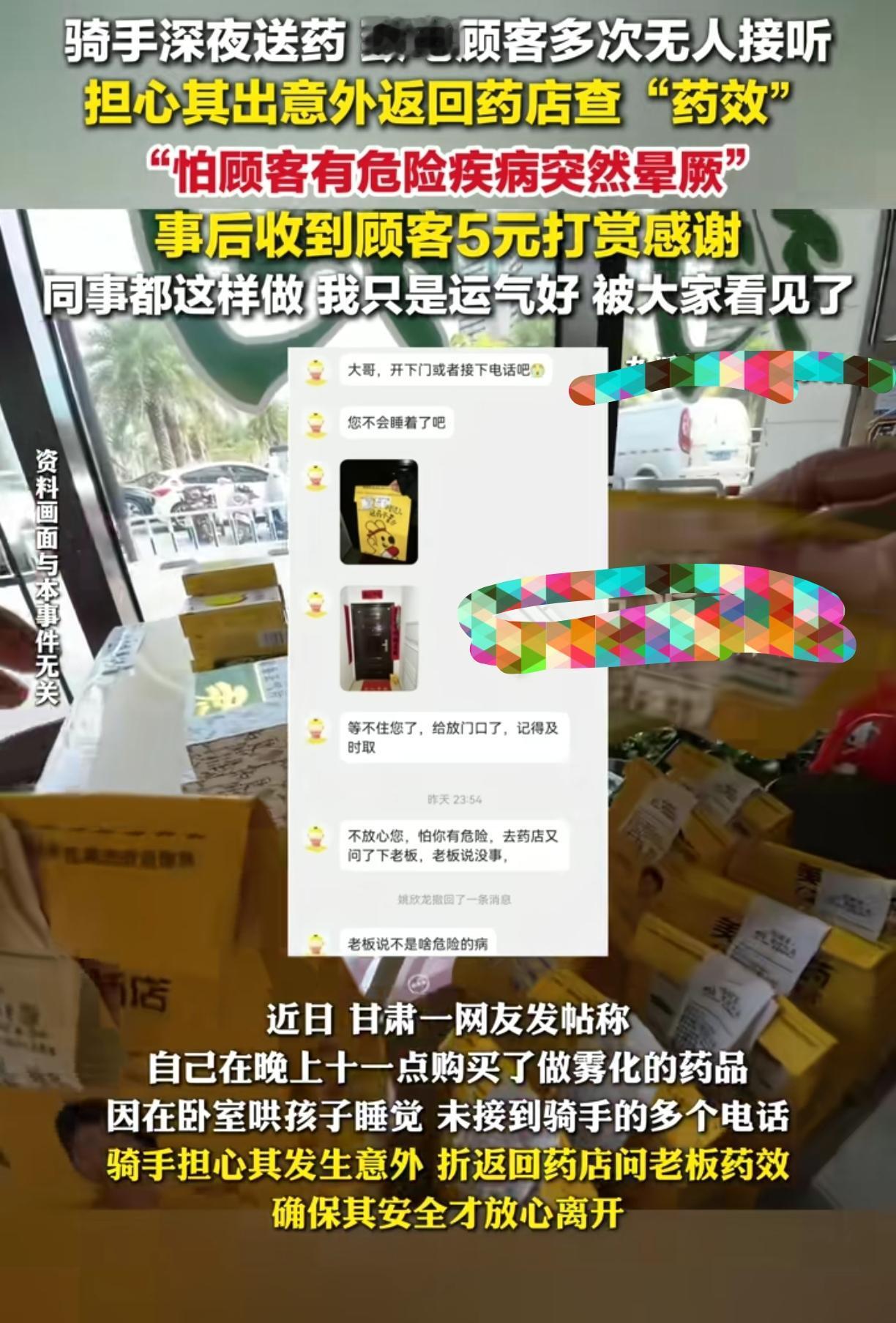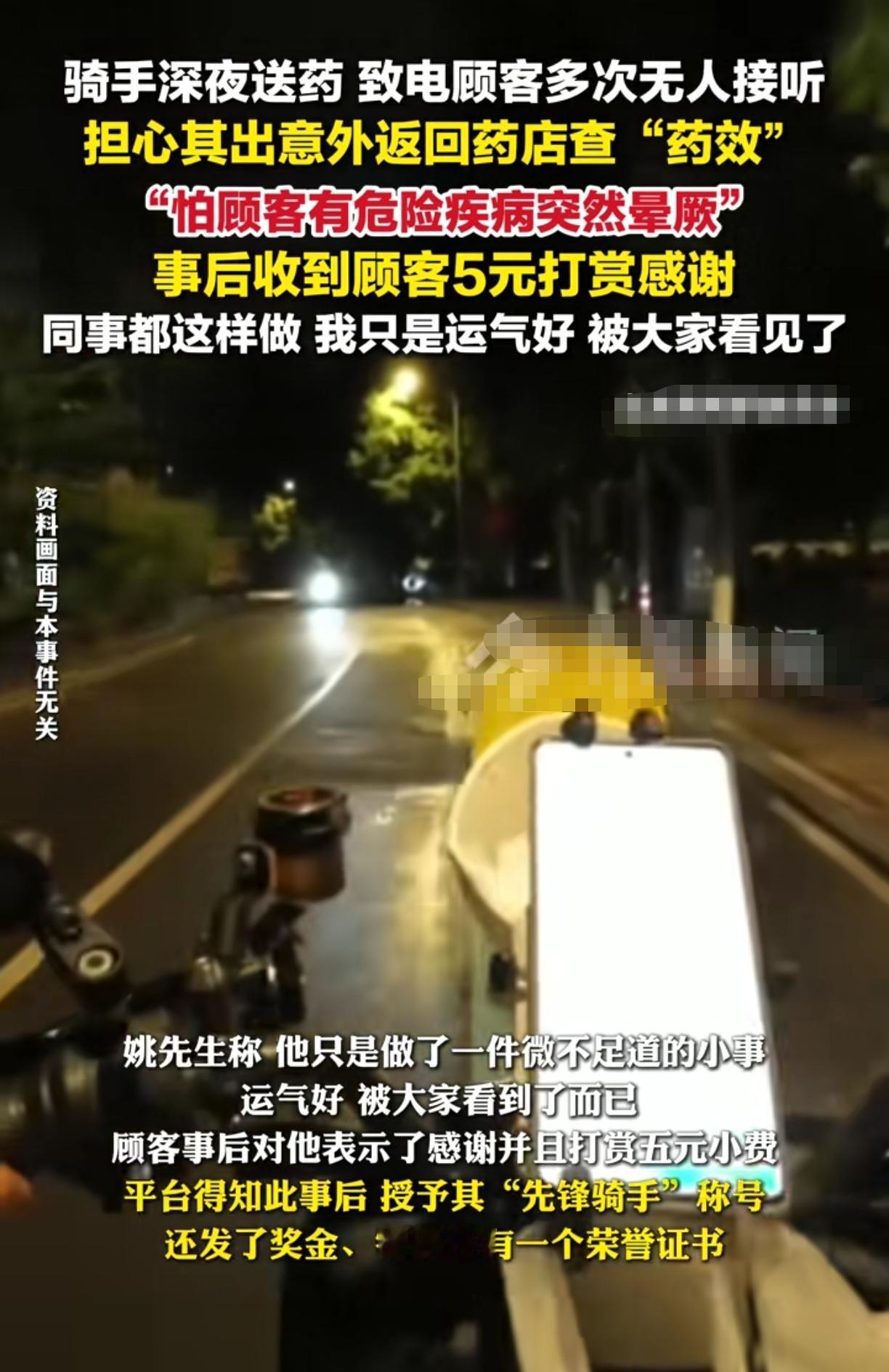骑手做了暖心的事收获了顾客5元的打赏 就这5块钱骑手姚先生没说话,评论区炸了 自己一条命只值5元? 一部分人认为5元也太少了吧! 骑手多次致电可顾客一直未接听,担心顾客出意外,特意折回药店查订单看药品“药效”,导致后续单子差点被延续,就这举止怎么也不只值5元吧! 虽然我很穷,我还是愿意给他一张红票子这样的好人已经用钱无法衡量了。 也有人说“心意到啦就行了”,别说5元那么少,首先顾客没意外,其次作为骑手就算给1块都会开心,觉得少的平时点外卖有给过小费嘛? 大家议论纷纷,各自有各自的想法和理由 当事人姚先生说“当自己折返回去,看到药品是雾化药,他也放心了,我的同事们都是这样做的,只是我比较幸运,做这事被大家看到,现在很开心,得到了大家伙的赞扬”。 美团方还给骑手奖励了锦旗,奖金,和荣誉证书,这事做的顾客,平台,骑手都高兴。 如果是你做了这般好事,收到5元奖励是会开心呢?还是会嫌少?