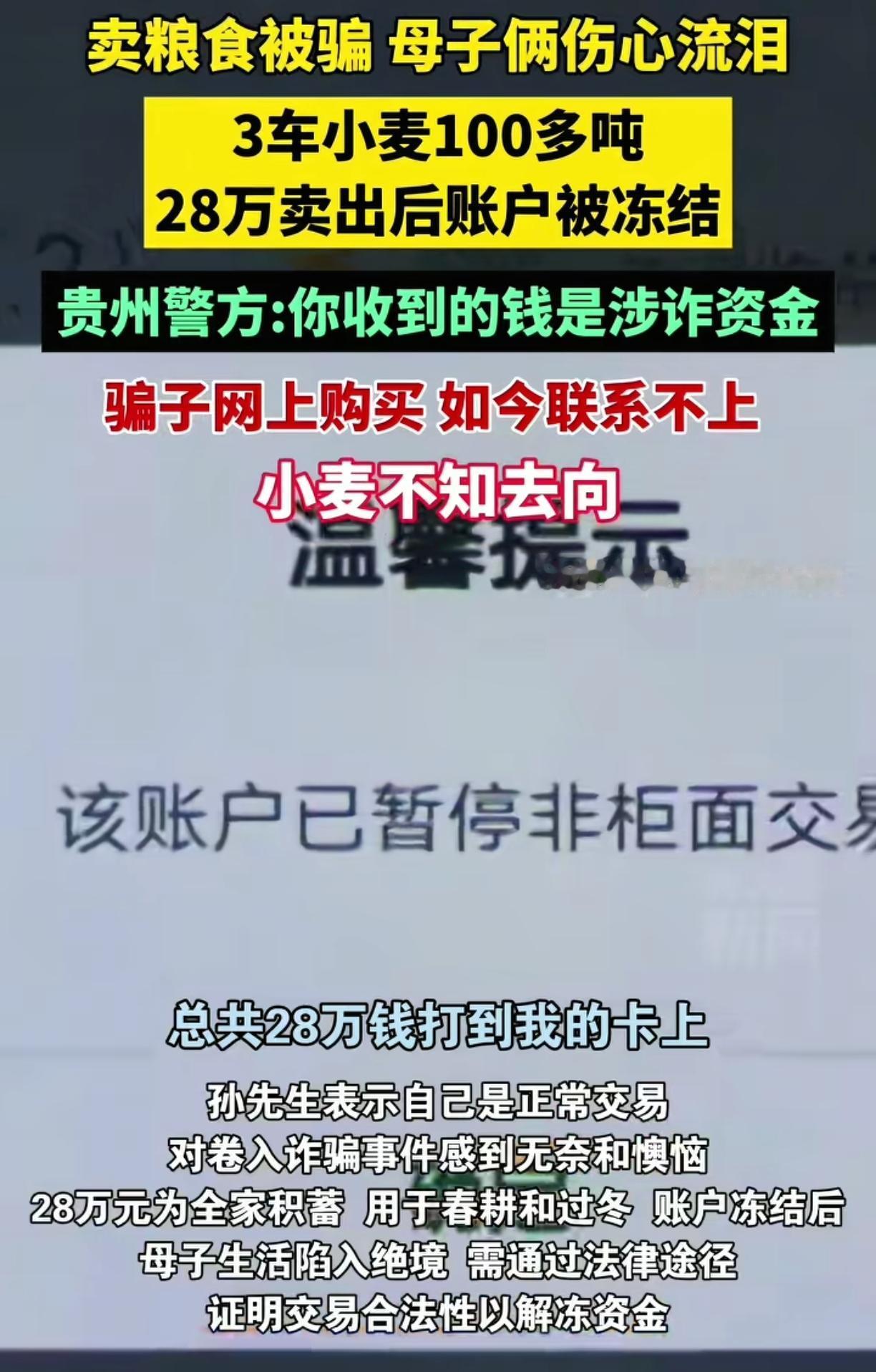 卖粮被骗这件事一开始就是有预谋的! 骗子以采购商的身份在网上套取了他家粮食的信息,问了他们小麦的容水量,质量怎么样,一共有多少斤? 估计这位孙先生把实际情况都给人家说了 随后骗子过来将粮食拉走了,一共3车,共100多吨,28万元打到自己账户,隔了两天收款账户被冻结了,现在生意都做不成! 孙先生悔不当初,不应该在网上找这种采购商,本想着是给家里减负担,结果带来更重的负担,如今钱被冻,小麦也不知道拉去了哪里,这28万里有20万是本钱,8万是这一家的血汗钱,一年到头忙碌就挣这些,最后还被骗子骗,老百姓真是苦啊! 这个事情经过大概就是A(骗子)骗了B(被骗一号) 28万,A(骗子)找C(卖粮人)买粮,B(被骗一号)把28万打到C(卖粮农民)手里,B(被骗一号)在反应后发觉自己被骗,报警,而此时28万的涉诈资金在卖粮农民手里,那卖粮人就是受害者二号啊,他该怎么拿回属于自己的钱呢,或者退一万步讲,警察能不能找到这3车麦子的所在,直接把麦子还回来也是可以的啊! 站在被骗钱的人的角度来看,骗子和商户也可能是一伙的共同做的局,那现在最紧要的不就是把小麦追回来,对吗? 所以这局该怎么破呢?有过有经验的朋友说说吗?