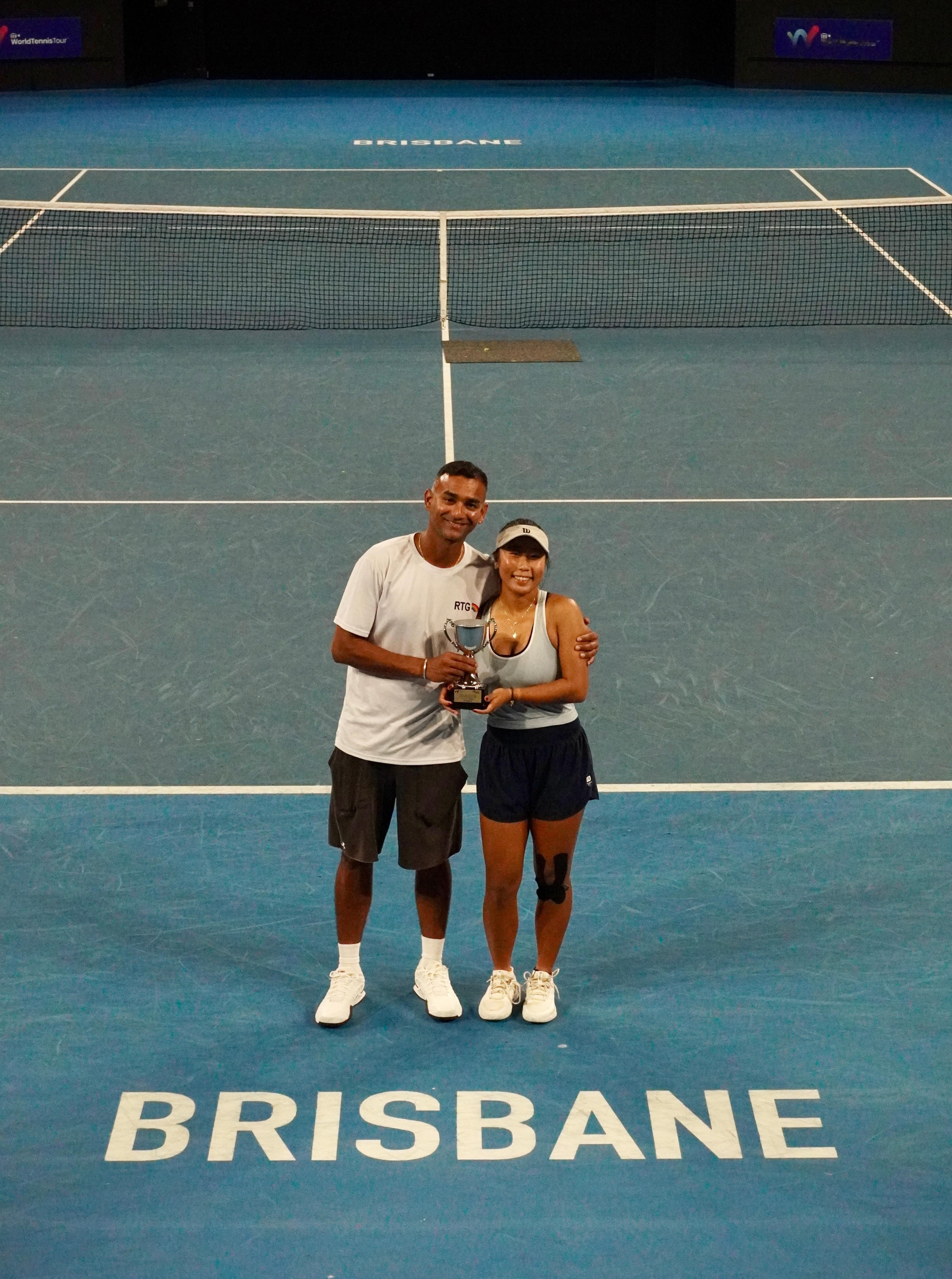 过去四个月,对于田方然和教练Mangal而言非常辛苦,当然也非常值得。伤愈后他们从香港、马鞍山、贵阳、武汉、京山、济南一直打到了布里斯班,直到今天所取得的胜利。这是然然腕伤之后的第一个单打冠军,虽然级别仅为W35,但那已是对她一年多才重返赛场最好的回报与证明。