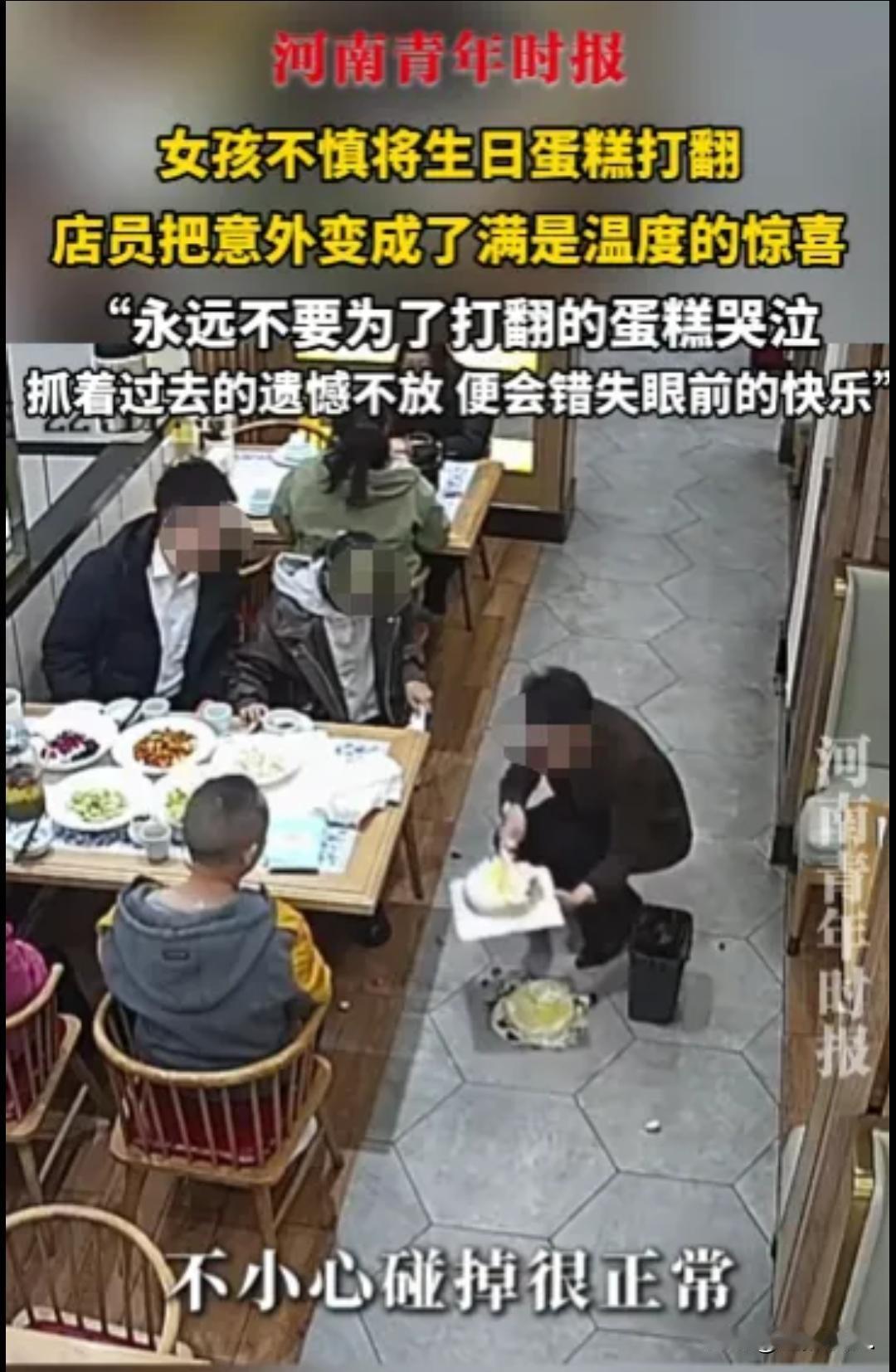 “这也太暖了吧!”10月24日,在新疆一家寻常餐馆里,一个女孩的生日宴上发生了意外的一幕——她起身拿水壶时,衣袖不小心带倒了桌边的生日蛋糕。 “啪”的一声,精致的蛋糕摔在地上,奶油溅了一地。女孩愣在原地,脸上的笑容瞬间凝固,眼里写满了无措和懊恼。 就在这尴尬的时刻,一位路过的店员阿姨快步走来。她没有责怪,没有抱怨,而是轻轻拍了拍女孩的肩膀:“没事的丫头,别着急,阿姨来帮你收拾。” 只见她利落地取来小刀,蹲下身仔细地把蛋糕完好的部分切下来,小心翼翼放回盘中。清理完地上的奶油后,这位阿姨又转身去了后厨,端来一盘新鲜水果——草莓、猕猴桃、葡萄,精心点缀在剩下的蛋糕上。原本残缺的蛋糕,转眼变成了一幅崭新的画面。 “这样不是更好看了吗?”阿姨笑眯眯地说。女孩原本紧绷的脸上,终于重新绽放出笑容,轻声说了句:“谢谢阿姨。” 这段温暖的视频在网上传开后,无数网友被深深打动:“隔着屏幕都能感受到这份善意!”“这个阿姨太好了,瞬间被治愈了。” 其实让人感动的,不只是阿姨及时伸出援手,更是她处理这件事时那份细腻的心思——她没有简单地收拾残局,而是用行动告诉女孩:生活中难免会有意外,但我们依然可以把破碎的美好,重新拼凑成新的风景。 在这个步履匆匆的时代,总有人用这样不经意的温柔提醒着我们:比起那个打翻的蛋糕,更重要的是身边人的理解和关怀。就像这位新疆的店员阿姨,她修补的不仅仅是一个生日蛋糕,更是一个女孩可能会被挫败感笼罩的重要时刻。 有时候啊,生活里那些不完美的小插曲,反而因为陌生人的善意,成了记忆里最温暖的定格。这份来自陌生人的体贴,让这个平凡的秋日,变得格外明亮。
