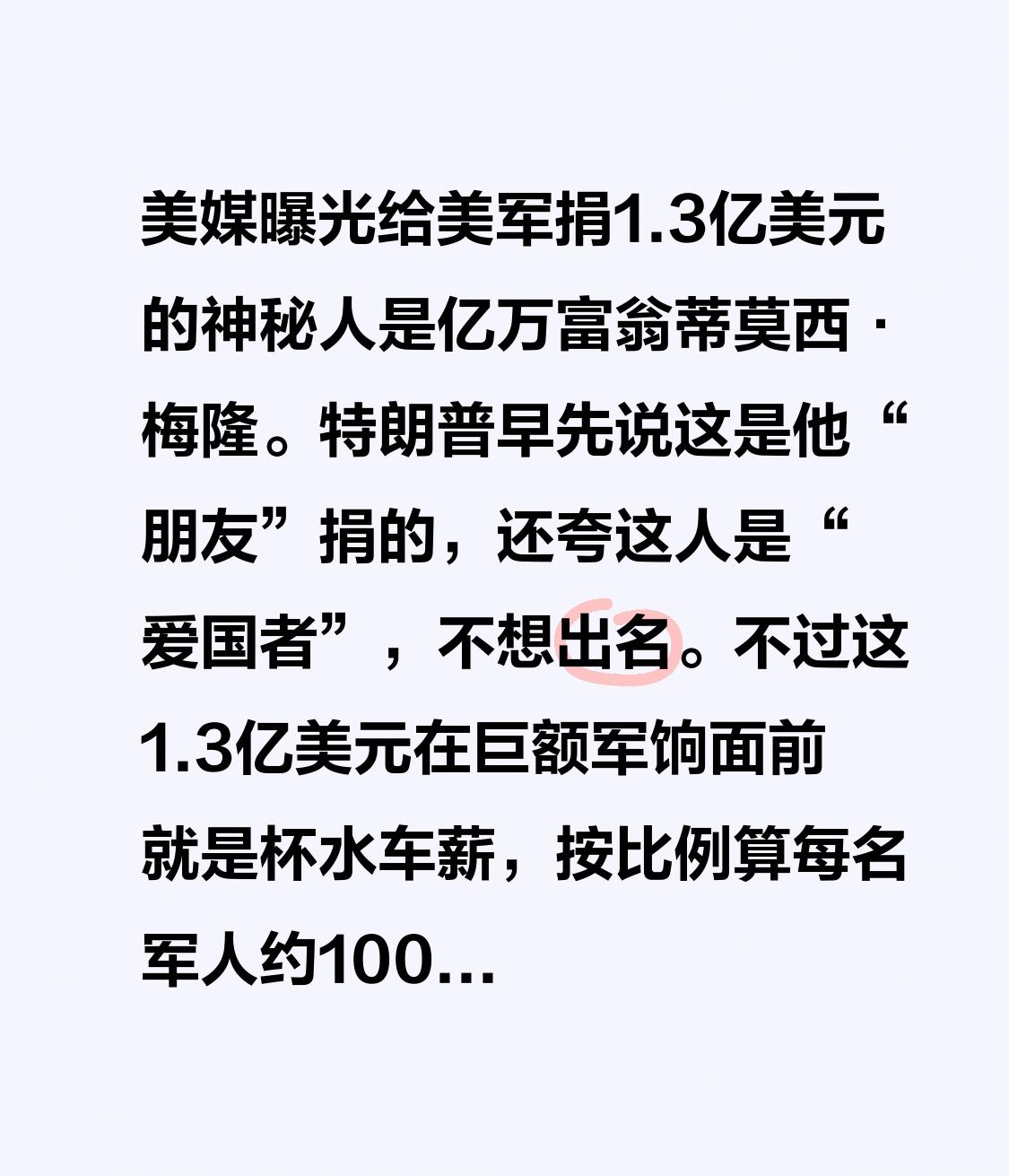 美媒曝光给美军捐1.3亿美元的神秘人是亿万富翁蒂莫西·梅隆。特朗普早先说这是他“朋友”捐的,还夸这人是“爱国者”,不想出名。 不过这1.3亿美元在巨额军饷面前就是杯水车薪,按比例算每名军人约100美元,甚至不够付美军1/3天工资。当时美国政府停摆,超50万联邦雇员都没全额领薪水。白宫对爆料拒绝置评,记者也联系不上梅隆及其代表。这神秘捐赠背后到底啥情况,还真是让人摸不着头脑。