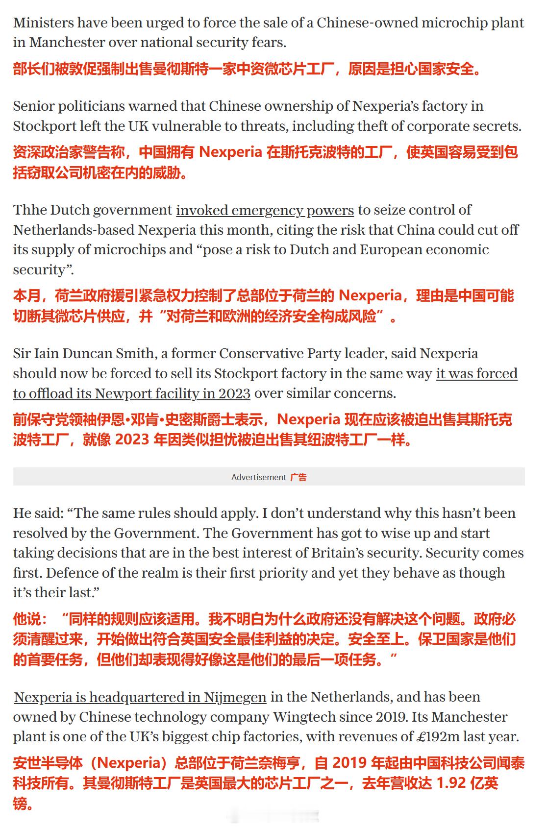 该工厂是英国规模较大的芯片厂之一,2024 年营收达 1.92 亿英镑,前保守党领袖伊恩・邓肯・史密斯爵士(Sir Iain Duncan Smith)等资深政客认为,中资持有该工厂使英国面临多重“风险”,包括“企业机密被盗”,且中国可能切断芯片供应,威胁英国“国家安全”。