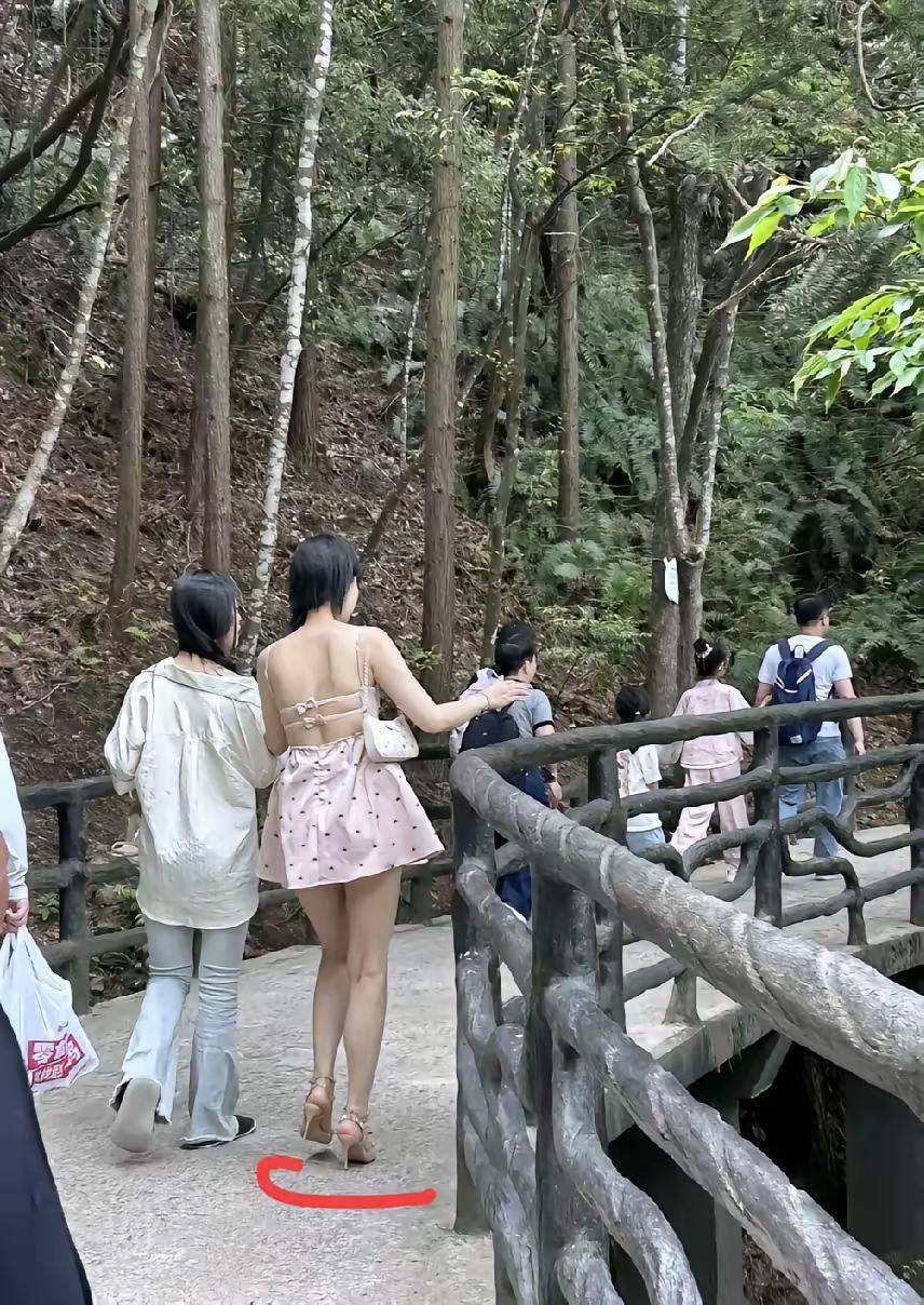 山林步道浸着湿凉,穿露背裙踩细高跟,这样合适吗 她刚走两步,鞋跟卡进石板缝,踉跄着扶护栏,露背沾了草屑。脚踝泛酸时她才觉出:这打扮,爬山实在太不合适。