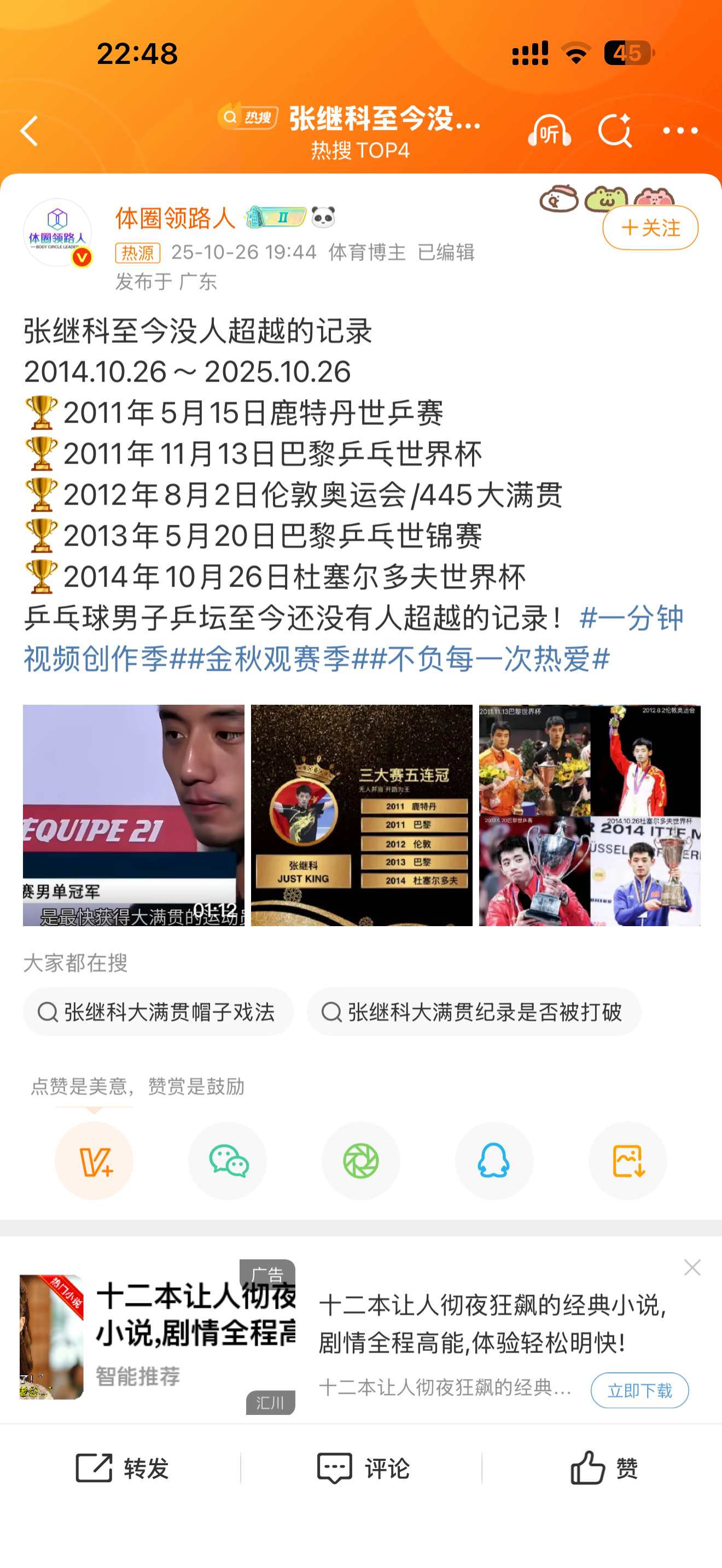 乒乓球张继科,羽毛球林丹,我感觉这两真是中国体育界的大满贯,拿了数不清的荣誉和奖杯,林丹和张继科在各自领域我想现在也都无人超越。
