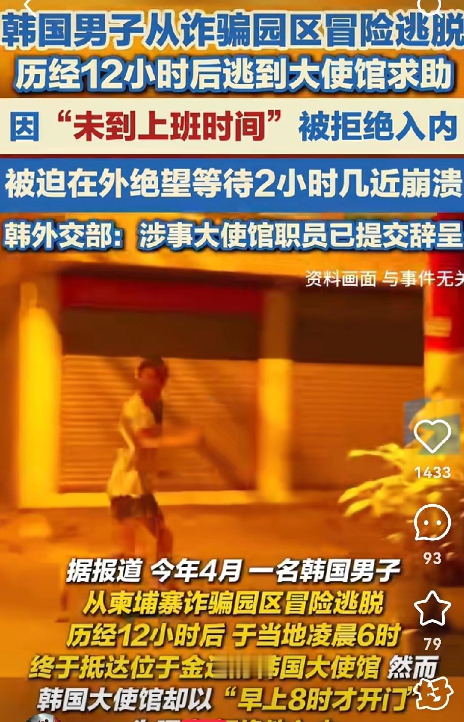 男子逃电诈园求救使馆被拒! 刚看到这新闻突然一惊,细看才发现是韩国小伙,不过 看完韩国小哥的遭遇,还是让人心里发寒!被骗去柬埔寨电诈园,九死一生逃出来,光着脚徒步12小时奔去本国大使馆,结果凌晨6点赶到,就被一句“没到上班时间”拦在门外。 他浑身是伤,连求着进停车场躲会儿都不行,只能在门外攥着心等2小时,生怕电诈园的人追上来。这大使馆是干啥吃的哦,本该是海外公民的救命稻草,反倒成了让人更绝望的地方。 后来职员辞职、外交部道歉,这种事情发生一次估计让民众够闹心了吧! 柬埔寨园区诈骗