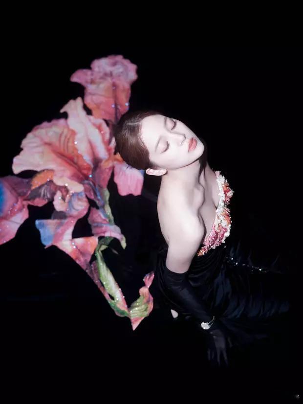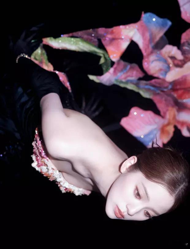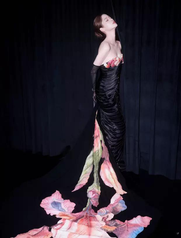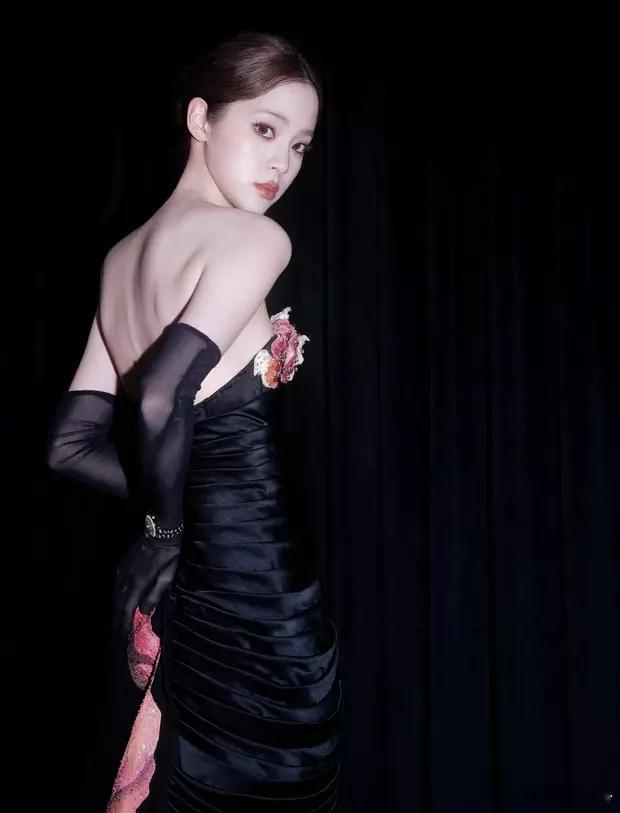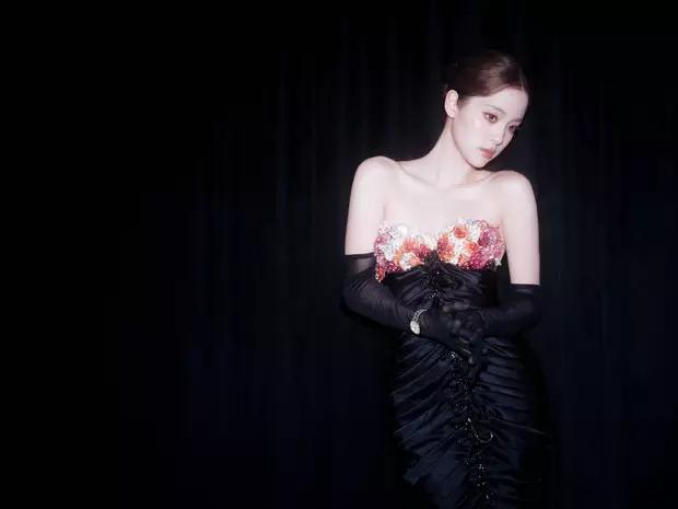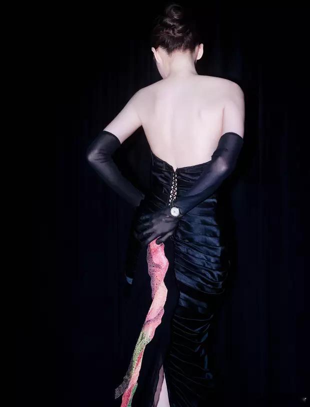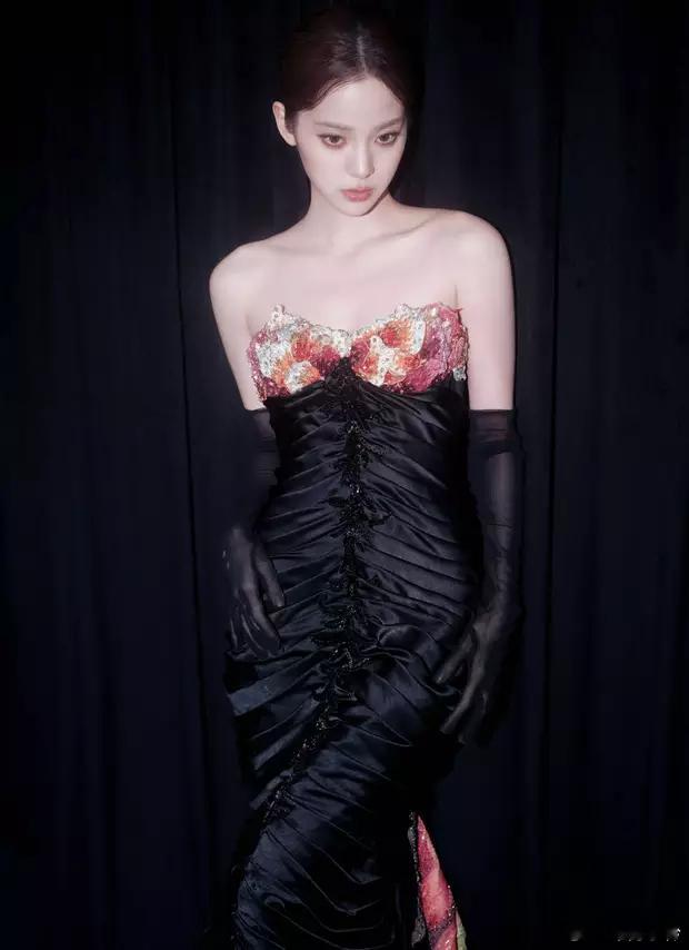 分享娱乐[超话]分享娱乐 欧阳娜娜身穿繁花抹胸黑色礼裙 气质高贵化身暗夜花仙