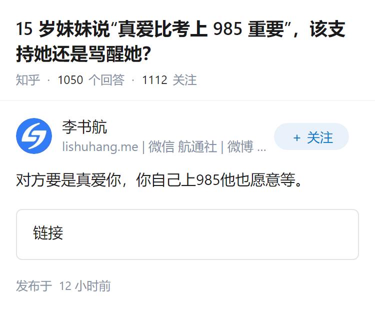 15 岁妹妹说“真爱比考上 985 重要”,该支持她还是骂醒她?