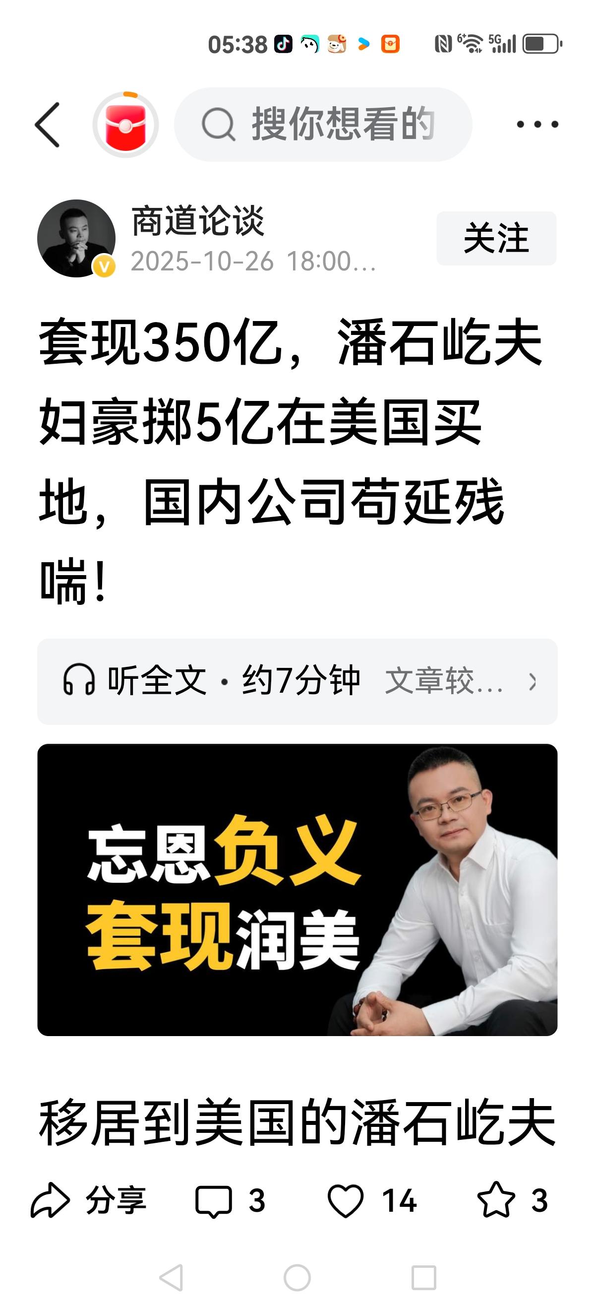 【你让潘石屹夫妻在国内投资地产吗?】 在国内北风狂吹,所谓房价还要降,最好是当前一半,有人还指望白菜价,可以说求稳都在苦苦挣扎,围绕房地产的配套企业都在风雨飘摇中。 就在这个大环境中,从美国传来消息:2025年10月,纽约中央公园边上六块地,让一对中国夫妇全款买下,花了七千六百万美元。 当然具体花多少钱传的五花八门,那对中国夫妻就是潘石屹夫妻。 很多人又给他们扣上“忘恩负义,套现润美国” 也有人称潘石屹是国内的李嘉诚,甚至超越李嘉诚,很早就抛售房产,预料房地产到顶了。 那么,很多质疑他们的人,你们总是说忘恩负义,是不是希望他们留在国内继续投资地产吗?是不是希望他们和许家印一样欠一屁股债? 商人成功就是预判形势的准确,及时转向,哪里有价值洼地去哪里,一边希望国际资本到国内投资,一边又骂潘石屹去美国投资? 当然有人怀疑潘石屹润出去钱有问题,那你就实打实拿出证据。 总之,不要眼红人家在哪里投资,只有培育好营商环境,吸引他们再回来才是正道。