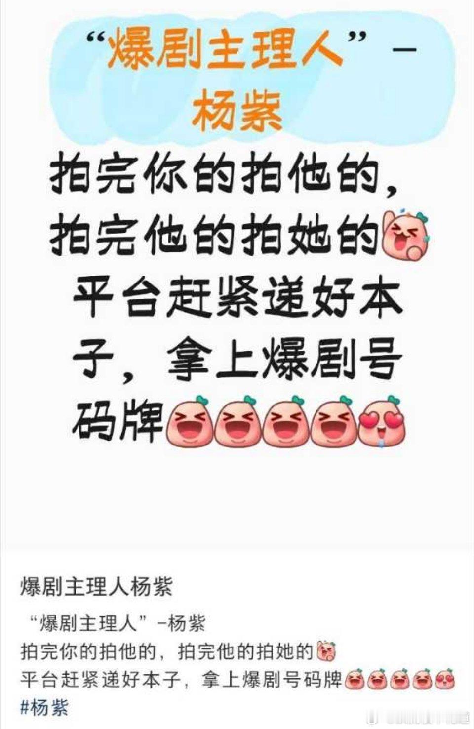 早上好,大家今天是不是在等你们的爆剧主理人-杨紫?恭喜杨紫喜提娱乐圈鸡排姐称号[笑cry][笑cry][笑cry]
