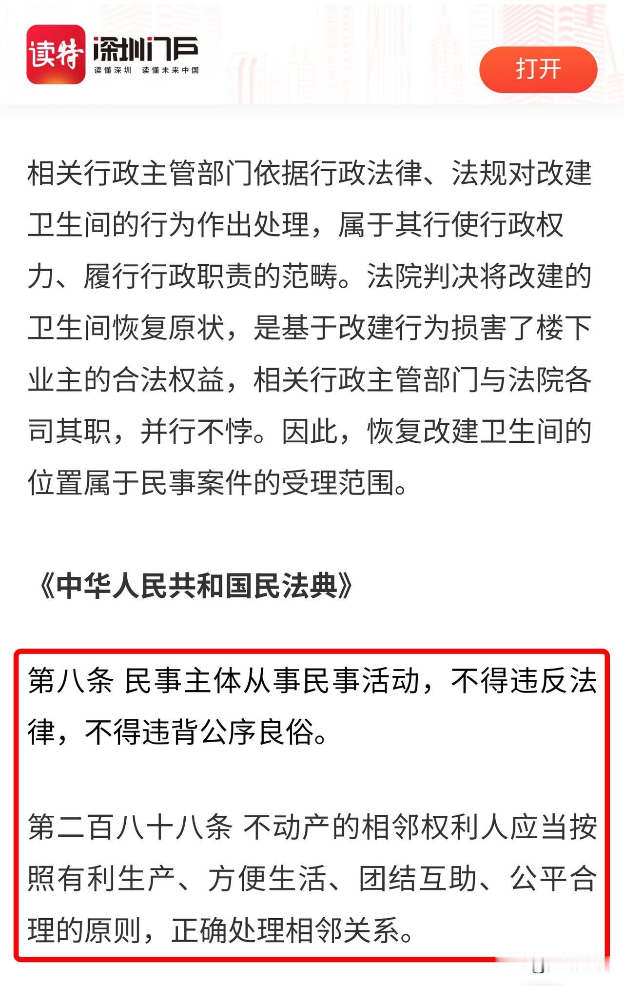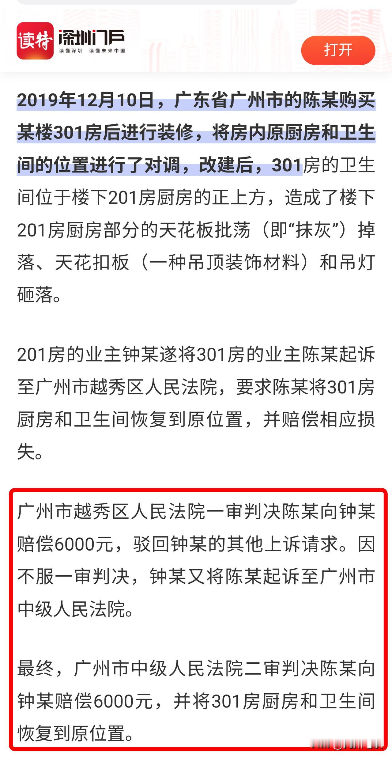“罚款6000元,恢复原状”,6年前广州已有私自改厨房卫生间判决成功案例!12月1日即将实施的《广州市房屋安全管理条例》绝非废纸一张束之高阁! 广州为了解决居民楼私改厨房厕所的问题,尤其把厕所改建到楼下的厨房、客厅、卧室的上面。影响楼下邻居的正常生活和休息,对楼下邻居心理影响也很大 。 邻里之间和睦相处、团结互助,才是符合公序良俗的。 把卫生间建在别人厨房上面,换位思考一下,自己家楼上也这样改,你觉得舒服吗? 所以对于集体居住的居民楼来说,维持建设之初的布局,才是最好的选择。