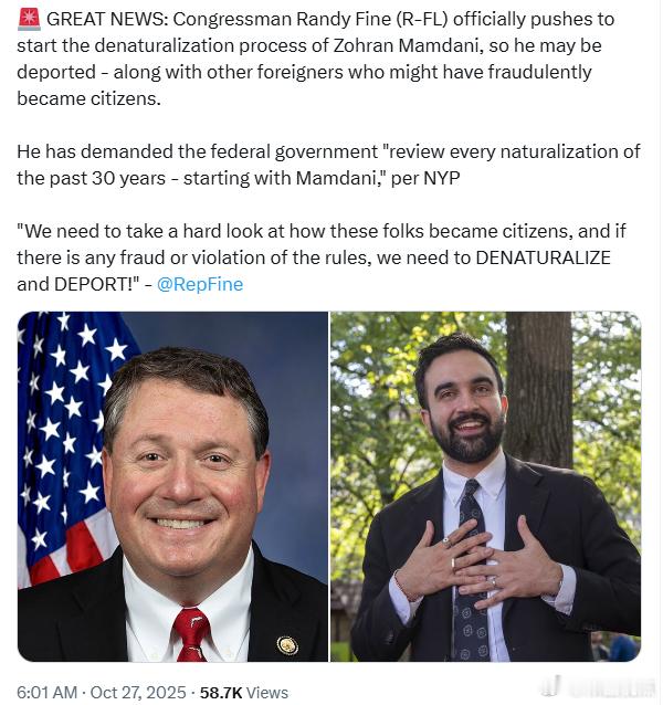 佛罗里达州共和党众议员兰迪·范恩正式推动启动对佐兰·曼达尼的“剥夺公民身份程序”,以便将他与其他可能通过欺诈手段获得公民身份的外国人一同驱逐出境。