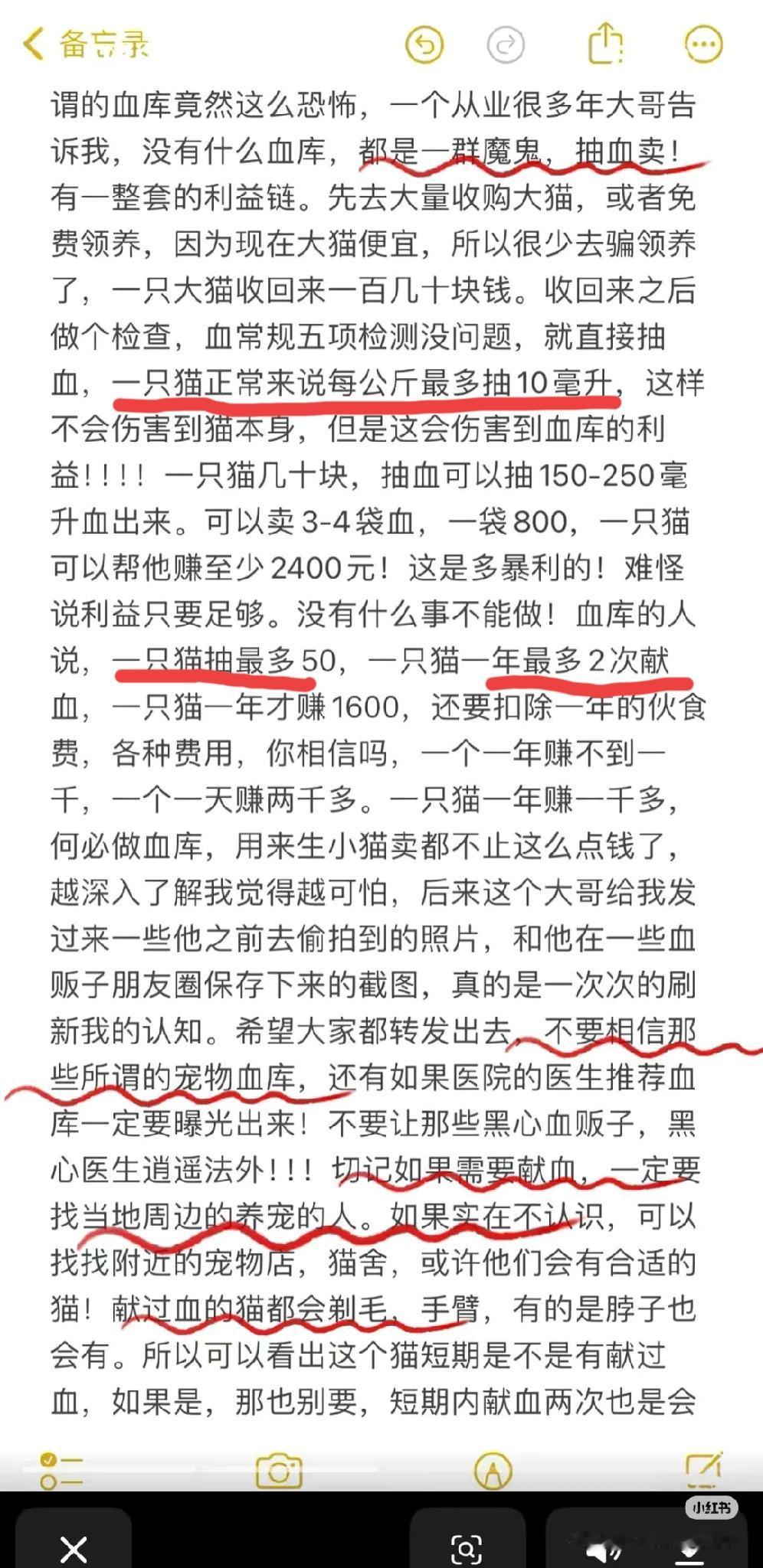 为了挣钱不择手段,将没人要的流浪猫抽血卖钱,一次一只猫真接抽净,抽净了血的猫被扔到草丛里,只能静静的等死。而抽出的血被卖到宠物医院,给受伤需要输血的宠物猫们续命,这不就是一命换一命吗?流浪猫的命也是命啊!人怎么可以为了挣钱疯狂到这种程度呢!你可以不爱它,也请别伤害它!