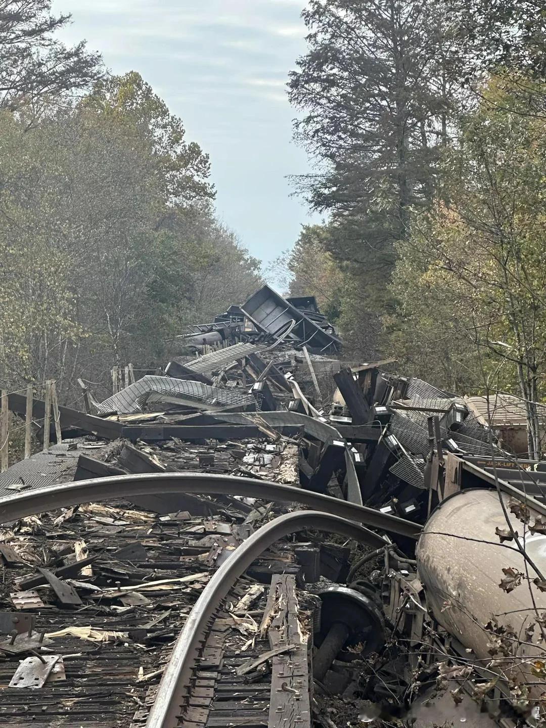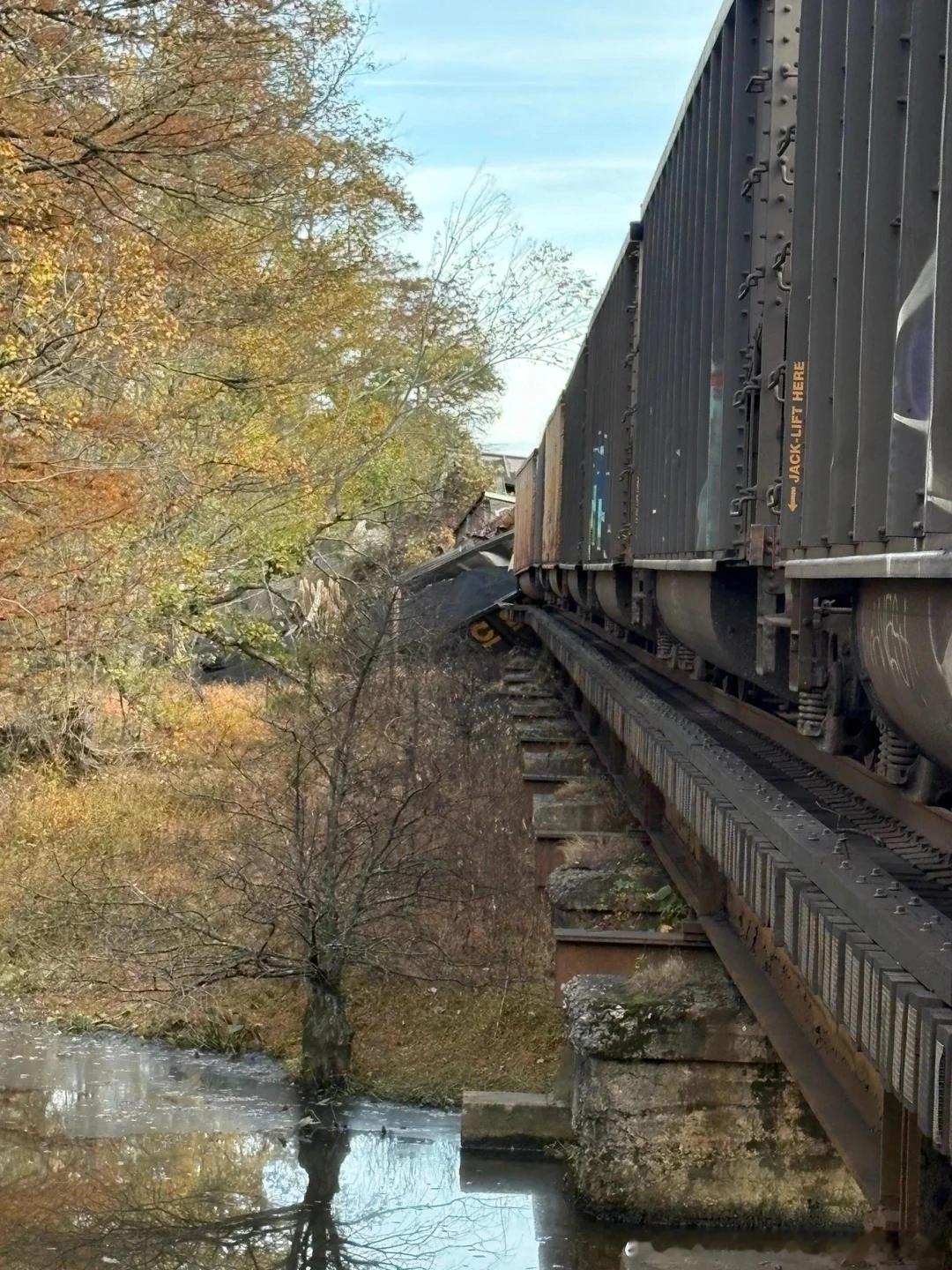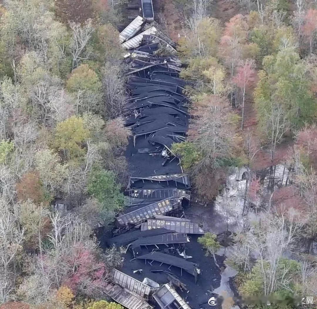 10月25日美国运煤火车发生重大脱轨事故,53节车皮和两辆火车头坠入弗吉尼亚州新肯特郡湿地热点现场